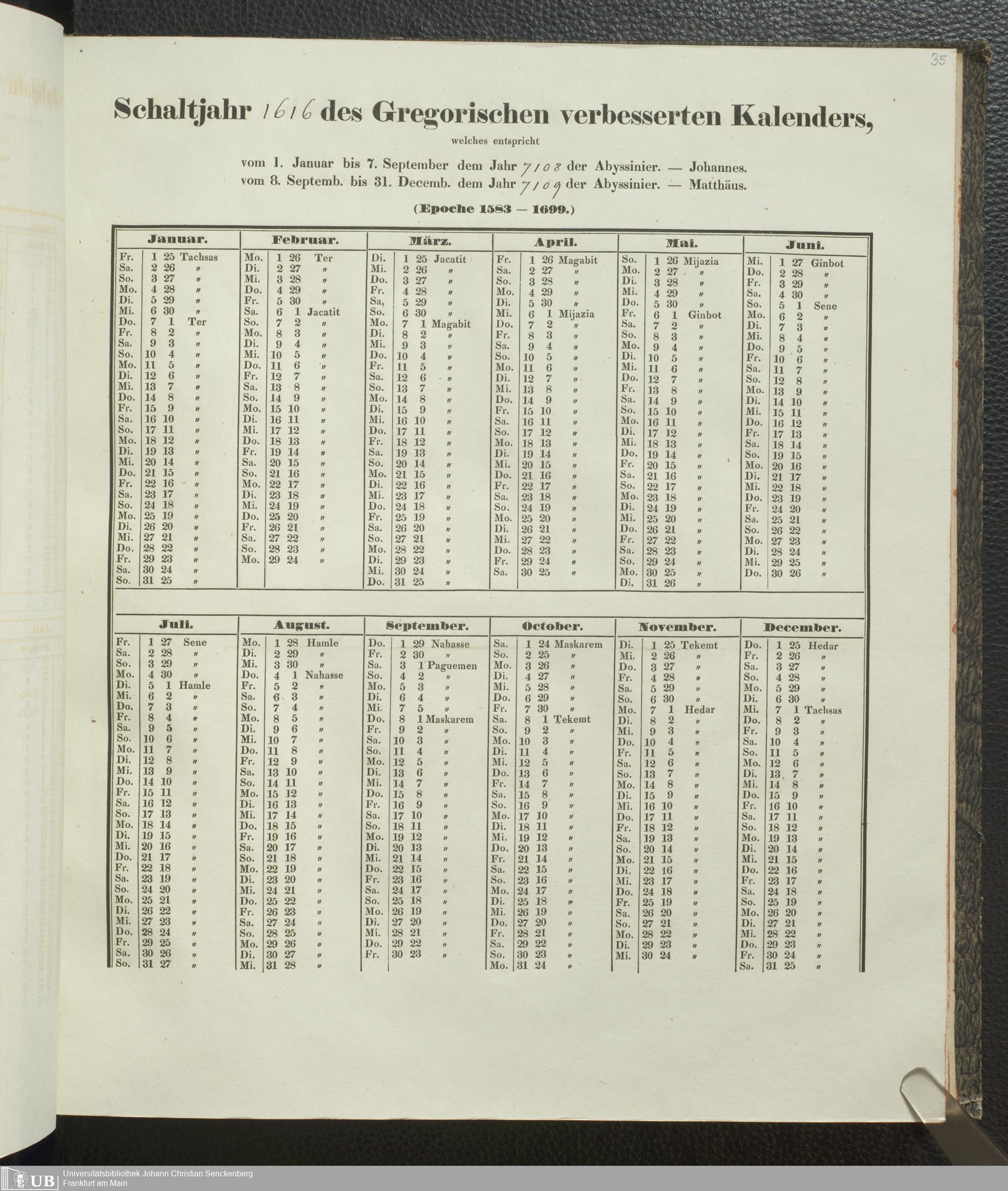 Ms. Ff. E. Rüppell IV - Kalender vom Jahr 1583 bis 1860, das heist seit der Einführung der durch Pabst Gregorius XIII verordneten Verbesserung, aus welchen Kalender die Gleichstellung dieser Zeitrechnung mit der von den Abyssiniern gebräuchlichen Chronologie ersehen werden kann; zum Behuf der geschichtlichen Forschungen der Abyssinischen Chroniken entworfen