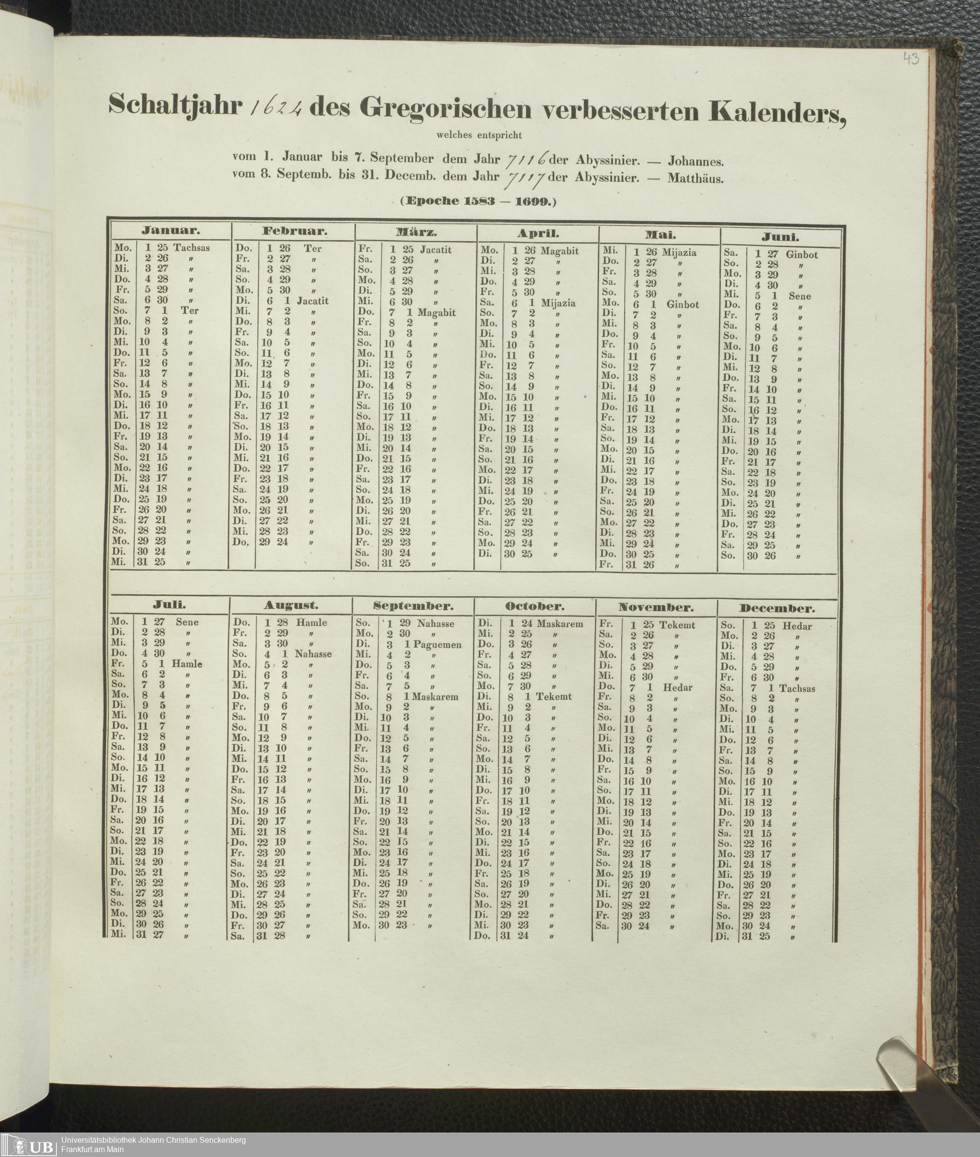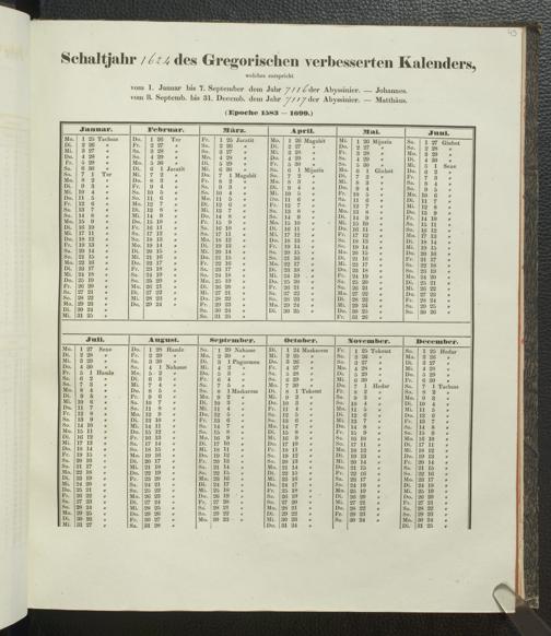 Ms. Ff. E. Rüppell IV - Kalender vom Jahr 1583 bis 1860, das heist seit der Einführung der durch Pabst Gregorius XIII verordneten Verbesserung, aus welchen Kalender die Gleichstellung dieser Zeitrechnung mit der von den Abyssiniern gebräuchlichen Chronologie ersehen werden kann; zum Behuf der geschichtlichen Forschungen der Abyssinischen Chroniken entworfen