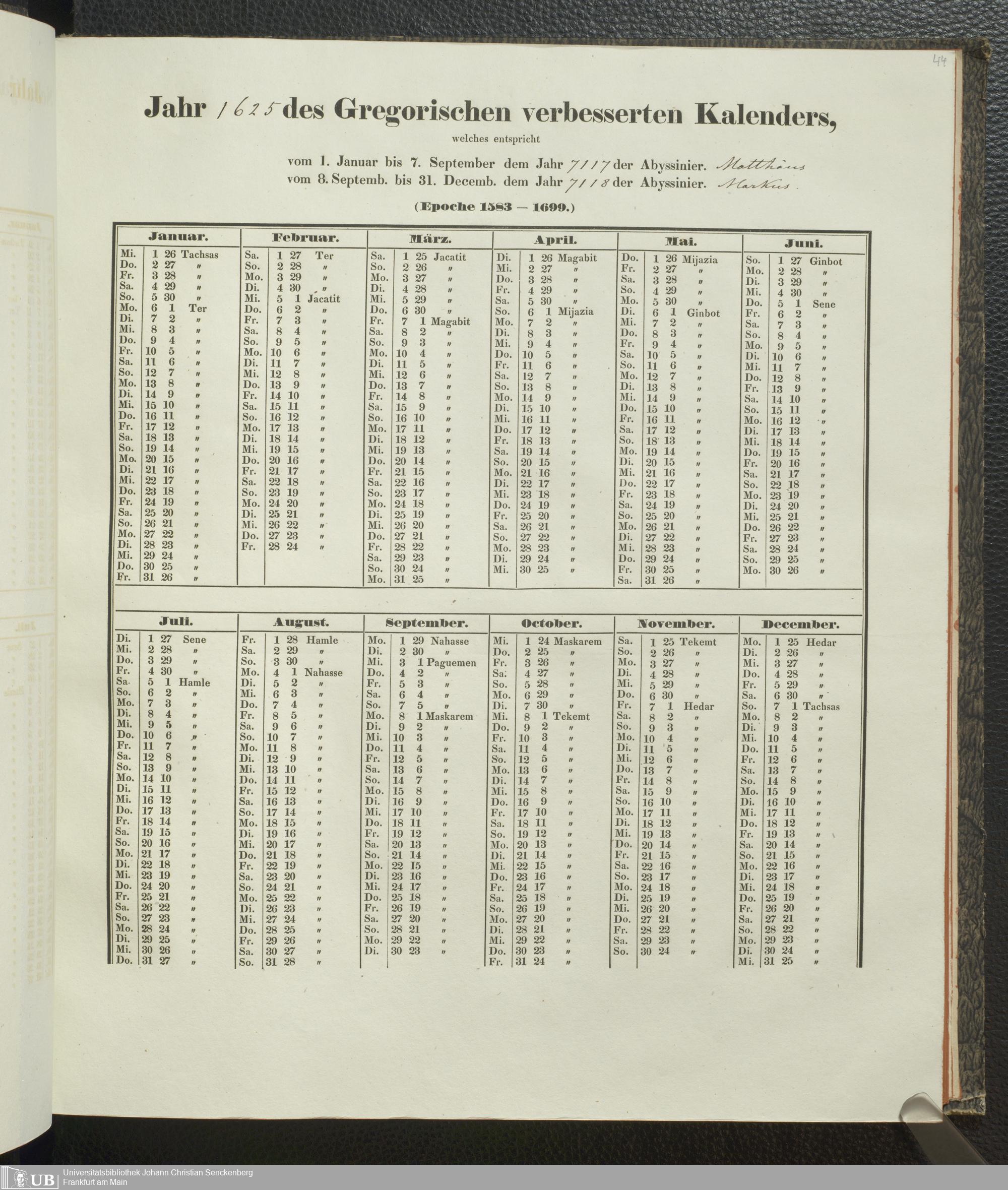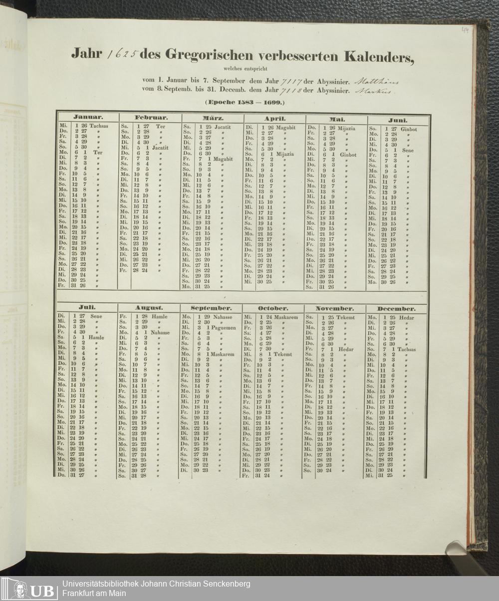 Ms. Ff. E. Rüppell IV - Kalender vom Jahr 1583 bis 1860, das heist seit der Einführung der durch Pabst Gregorius XIII verordneten Verbesserung, aus welchen Kalender die Gleichstellung dieser Zeitrechnung mit der von den Abyssiniern gebräuchlichen Chronologie ersehen werden kann; zum Behuf der geschichtlichen Forschungen der Abyssinischen Chroniken entworfen