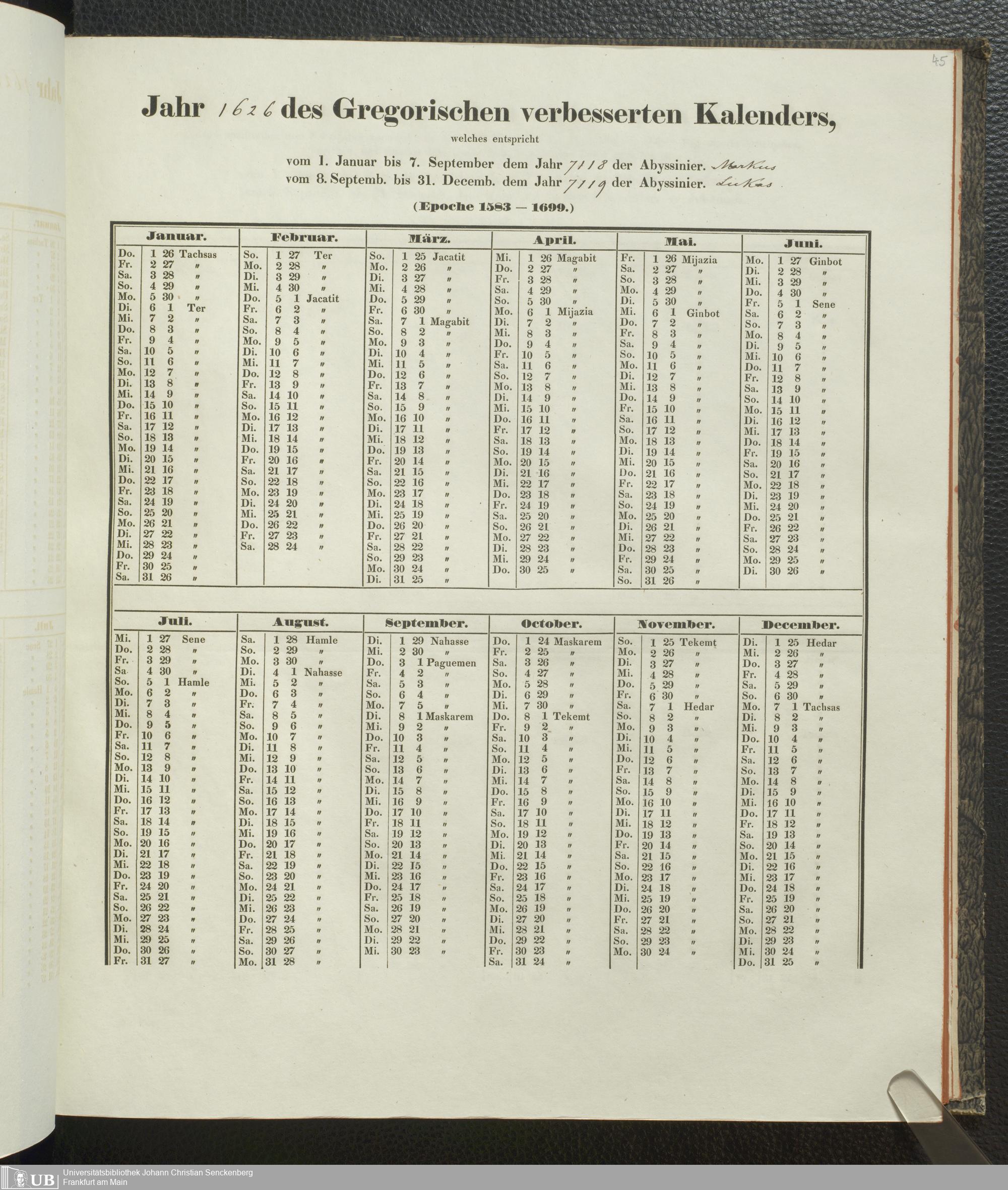 Ms. Ff. E. Rüppell IV - Kalender vom Jahr 1583 bis 1860, das heist seit der Einführung der durch Pabst Gregorius XIII verordneten Verbesserung, aus welchen Kalender die Gleichstellung dieser Zeitrechnung mit der von den Abyssiniern gebräuchlichen Chronologie ersehen werden kann; zum Behuf der geschichtlichen Forschungen der Abyssinischen Chroniken entworfen