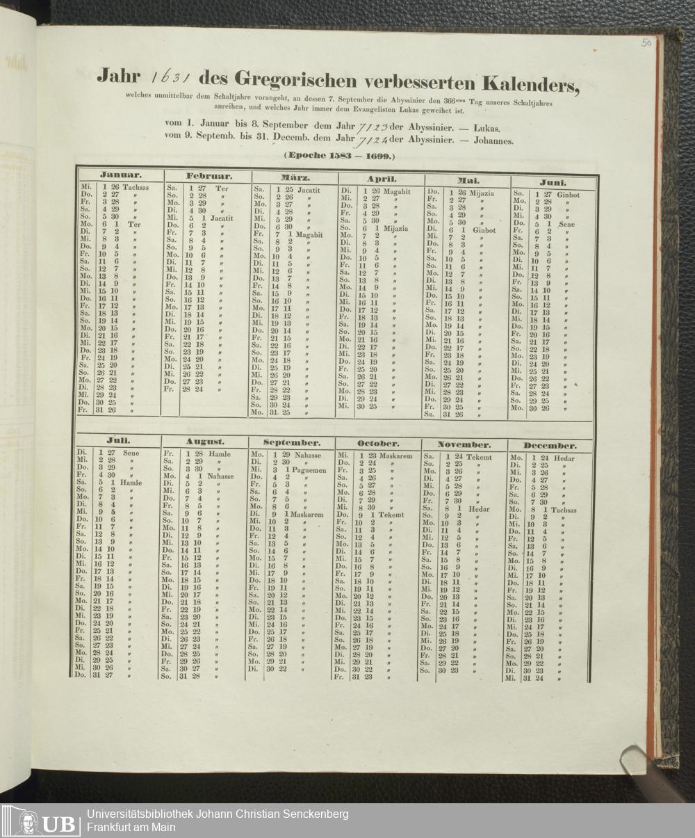Ms. Ff. E. Rüppell IV - Kalender vom Jahr 1583 bis 1860, das heist seit der Einführung der durch Pabst Gregorius XIII verordneten Verbesserung, aus welchen Kalender die Gleichstellung dieser Zeitrechnung mit der von den Abyssiniern gebräuchlichen Chronologie ersehen werden kann; zum Behuf der geschichtlichen Forschungen der Abyssinischen Chroniken entworfen