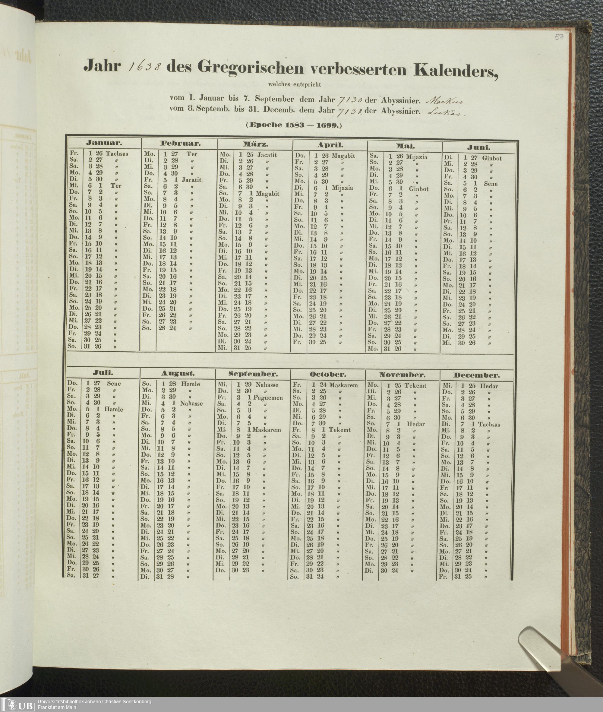 Ms. Ff. E. Rüppell IV - Kalender vom Jahr 1583 bis 1860, das heist seit der Einführung der durch Pabst Gregorius XIII verordneten Verbesserung, aus welchen Kalender die Gleichstellung dieser Zeitrechnung mit der von den Abyssiniern gebräuchlichen Chronologie ersehen werden kann; zum Behuf der geschichtlichen Forschungen der Abyssinischen Chroniken entworfen