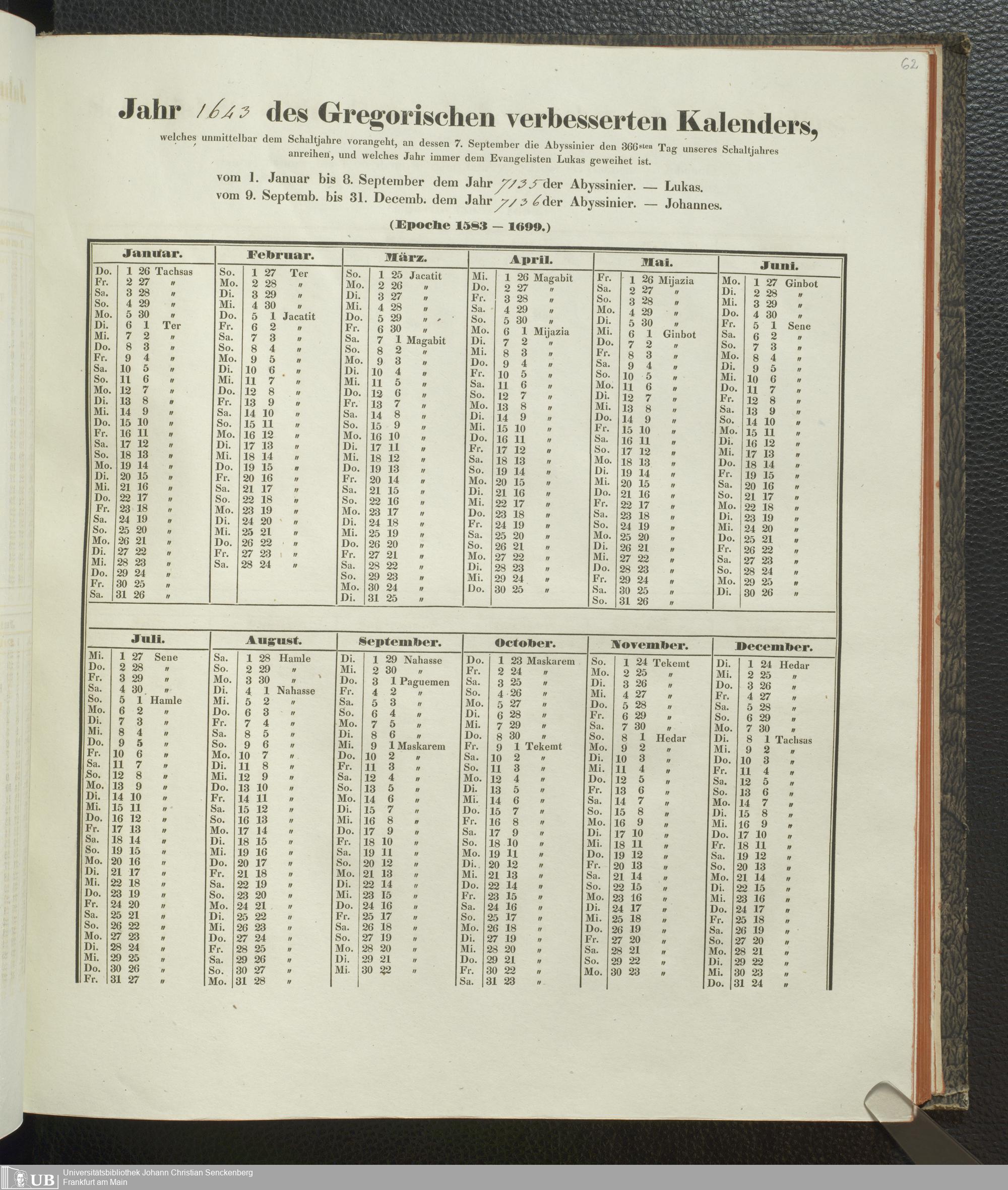 Ms. Ff. E. Rüppell IV - Kalender vom Jahr 1583 bis 1860, das heist seit der Einführung der durch Pabst Gregorius XIII verordneten Verbesserung, aus welchen Kalender die Gleichstellung dieser Zeitrechnung mit der von den Abyssiniern gebräuchlichen Chronologie ersehen werden kann; zum Behuf der geschichtlichen Forschungen der Abyssinischen Chroniken entworfen