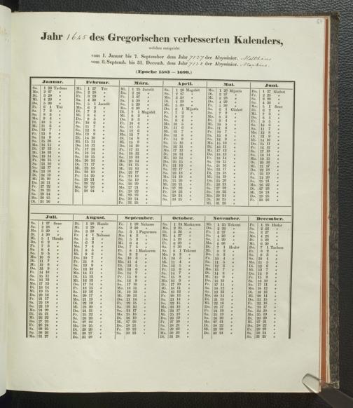 Ms. Ff. E. Rüppell IV - Kalender vom Jahr 1583 bis 1860, das heist seit der Einführung der durch Pabst Gregorius XIII verordneten Verbesserung, aus welchen Kalender die Gleichstellung dieser Zeitrechnung mit der von den Abyssiniern gebräuchlichen Chronologie ersehen werden kann; zum Behuf der geschichtlichen Forschungen der Abyssinischen Chroniken entworfen