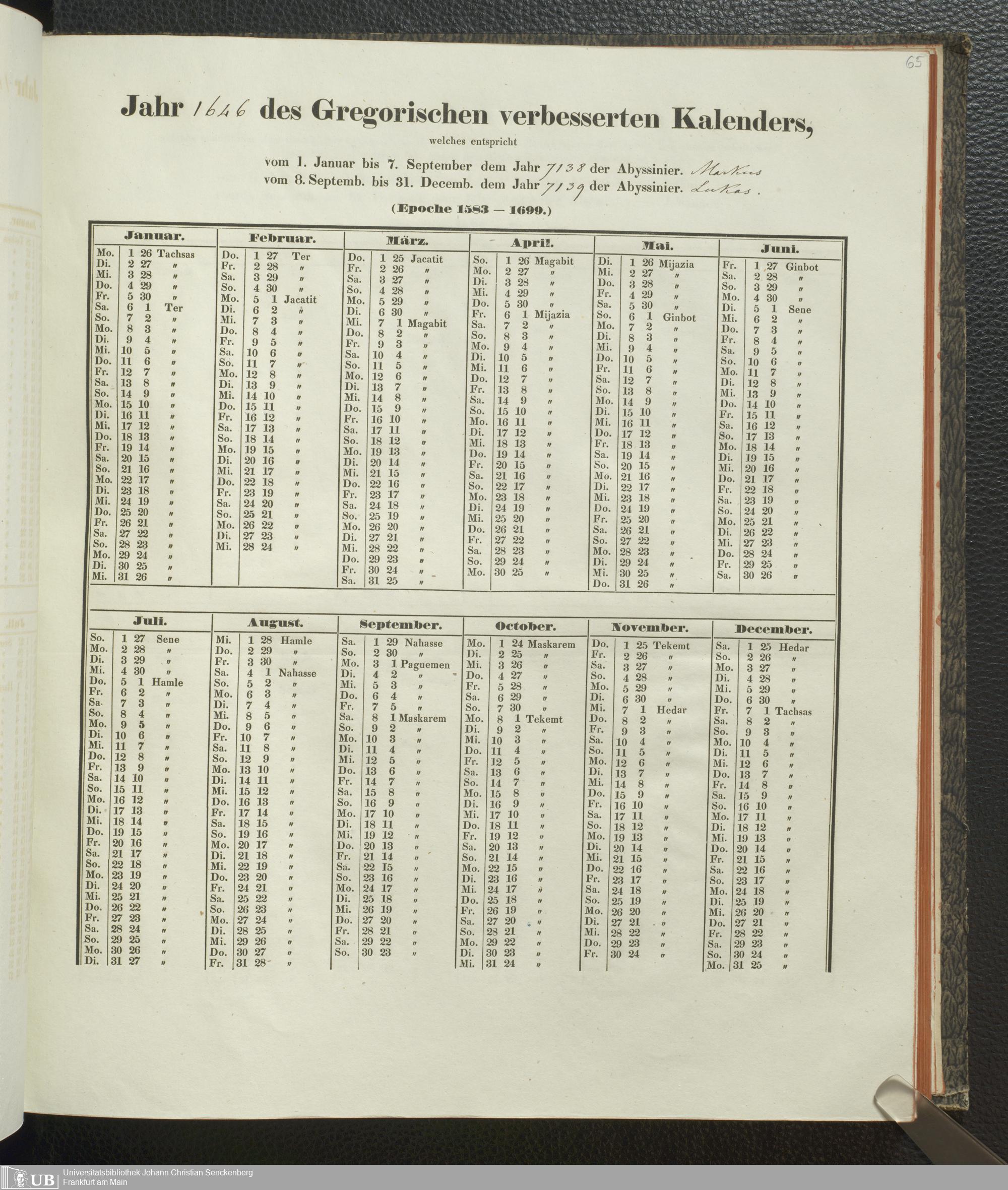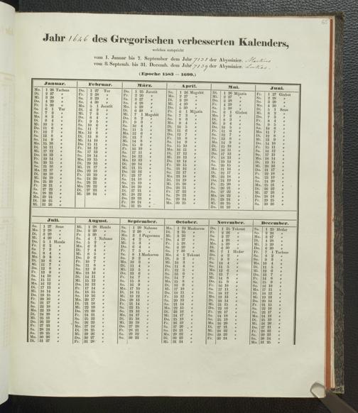 Ms. Ff. E. Rüppell IV - Kalender vom Jahr 1583 bis 1860, das heist seit der Einführung der durch Pabst Gregorius XIII verordneten Verbesserung, aus welchen Kalender die Gleichstellung dieser Zeitrechnung mit der von den Abyssiniern gebräuchlichen Chronologie ersehen werden kann; zum Behuf der geschichtlichen Forschungen der Abyssinischen Chroniken entworfen