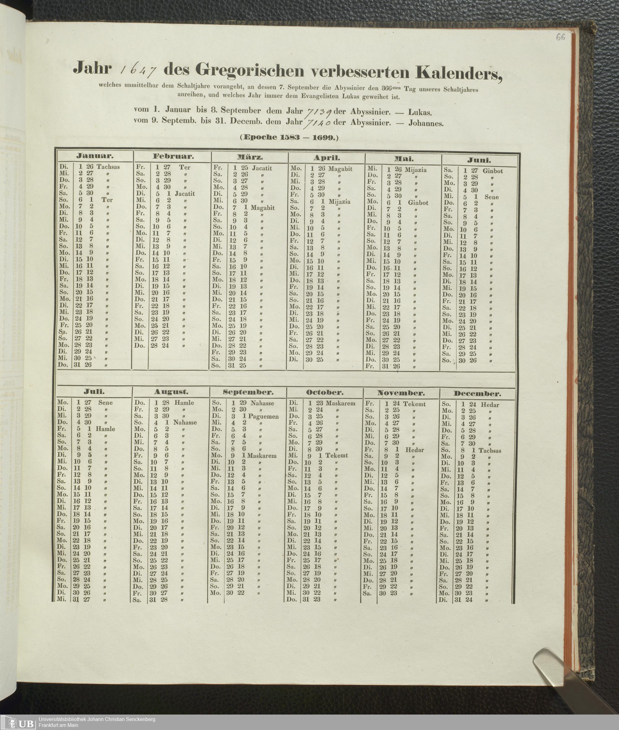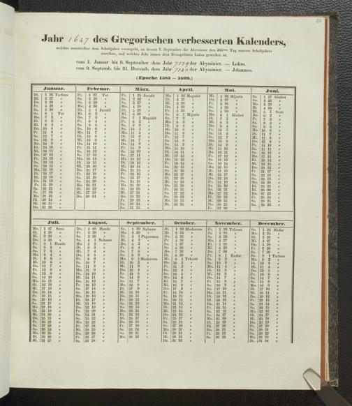 Ms. Ff. E. Rüppell IV - Kalender vom Jahr 1583 bis 1860, das heist seit der Einführung der durch Pabst Gregorius XIII verordneten Verbesserung, aus welchen Kalender die Gleichstellung dieser Zeitrechnung mit der von den Abyssiniern gebräuchlichen Chronologie ersehen werden kann; zum Behuf der geschichtlichen Forschungen der Abyssinischen Chroniken entworfen