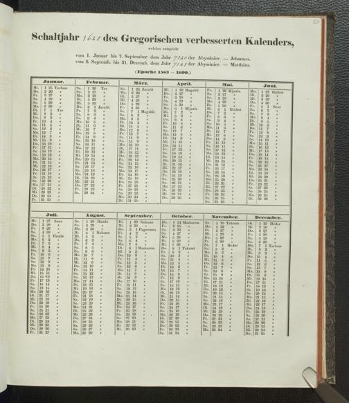 Ms. Ff. E. Rüppell IV - Kalender vom Jahr 1583 bis 1860, das heist seit der Einführung der durch Pabst Gregorius XIII verordneten Verbesserung, aus welchen Kalender die Gleichstellung dieser Zeitrechnung mit der von den Abyssiniern gebräuchlichen Chronologie ersehen werden kann; zum Behuf der geschichtlichen Forschungen der Abyssinischen Chroniken entworfen