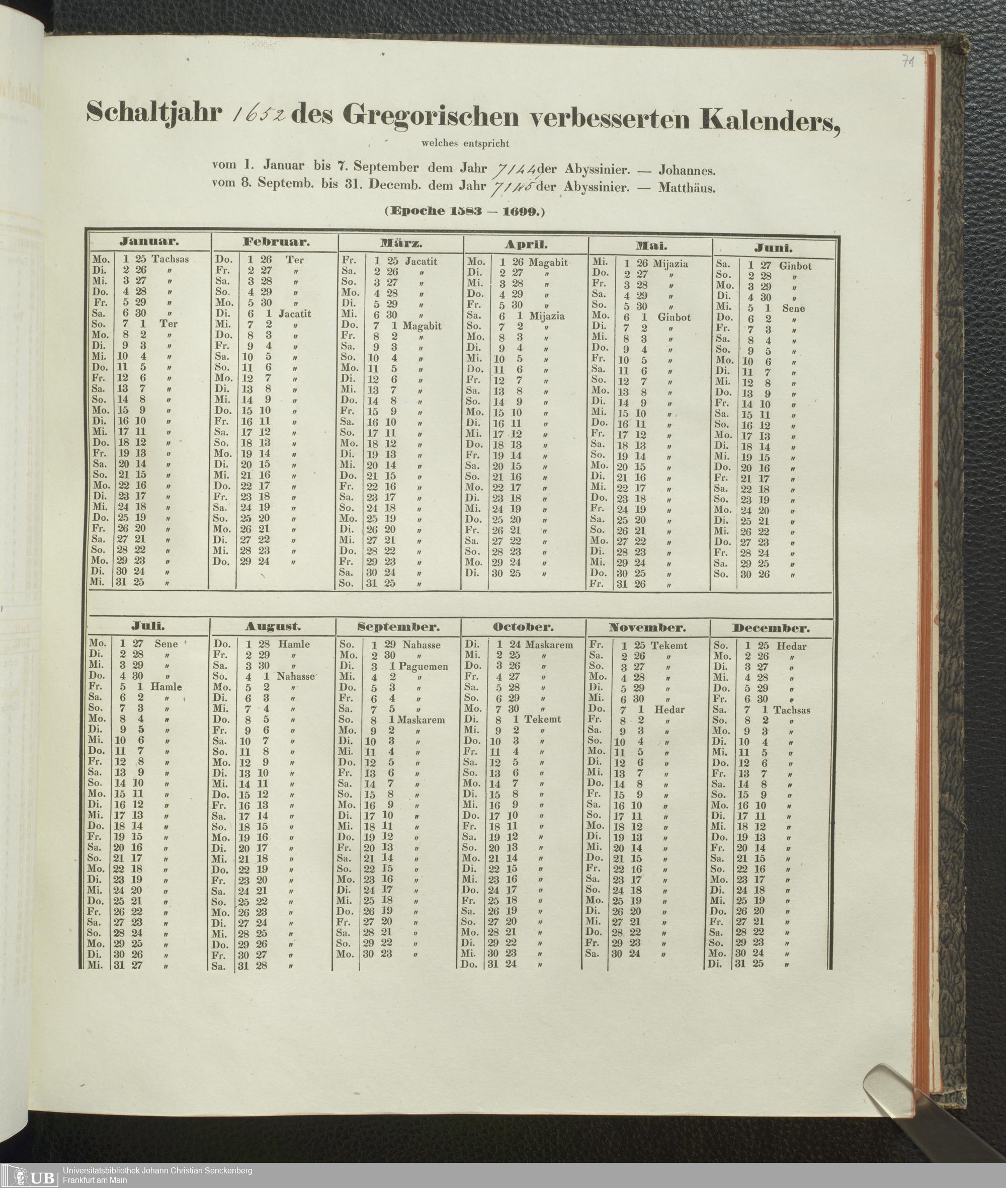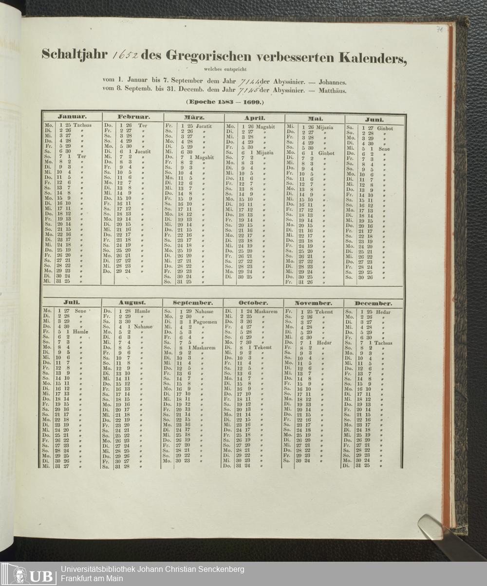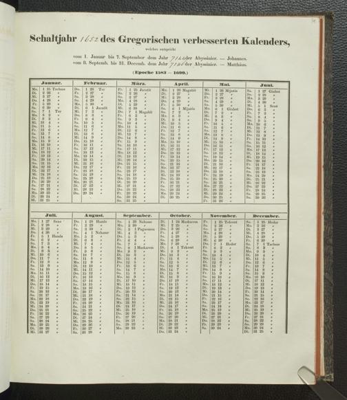 Ms. Ff. E. Rüppell IV - Kalender vom Jahr 1583 bis 1860, das heist seit der Einführung der durch Pabst Gregorius XIII verordneten Verbesserung, aus welchen Kalender die Gleichstellung dieser Zeitrechnung mit der von den Abyssiniern gebräuchlichen Chronologie ersehen werden kann; zum Behuf der geschichtlichen Forschungen der Abyssinischen Chroniken entworfen
