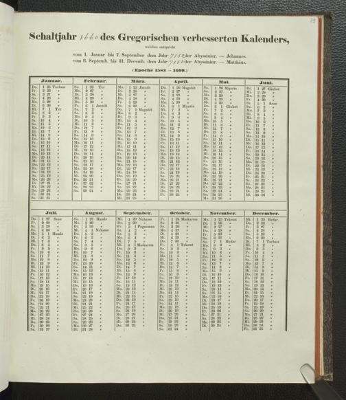 Ms. Ff. E. Rüppell IV - Kalender vom Jahr 1583 bis 1860, das heist seit der Einführung der durch Pabst Gregorius XIII verordneten Verbesserung, aus welchen Kalender die Gleichstellung dieser Zeitrechnung mit der von den Abyssiniern gebräuchlichen Chronologie ersehen werden kann; zum Behuf der geschichtlichen Forschungen der Abyssinischen Chroniken entworfen