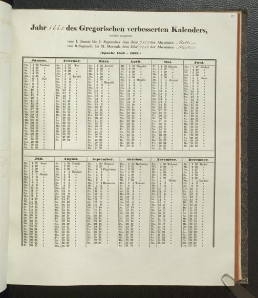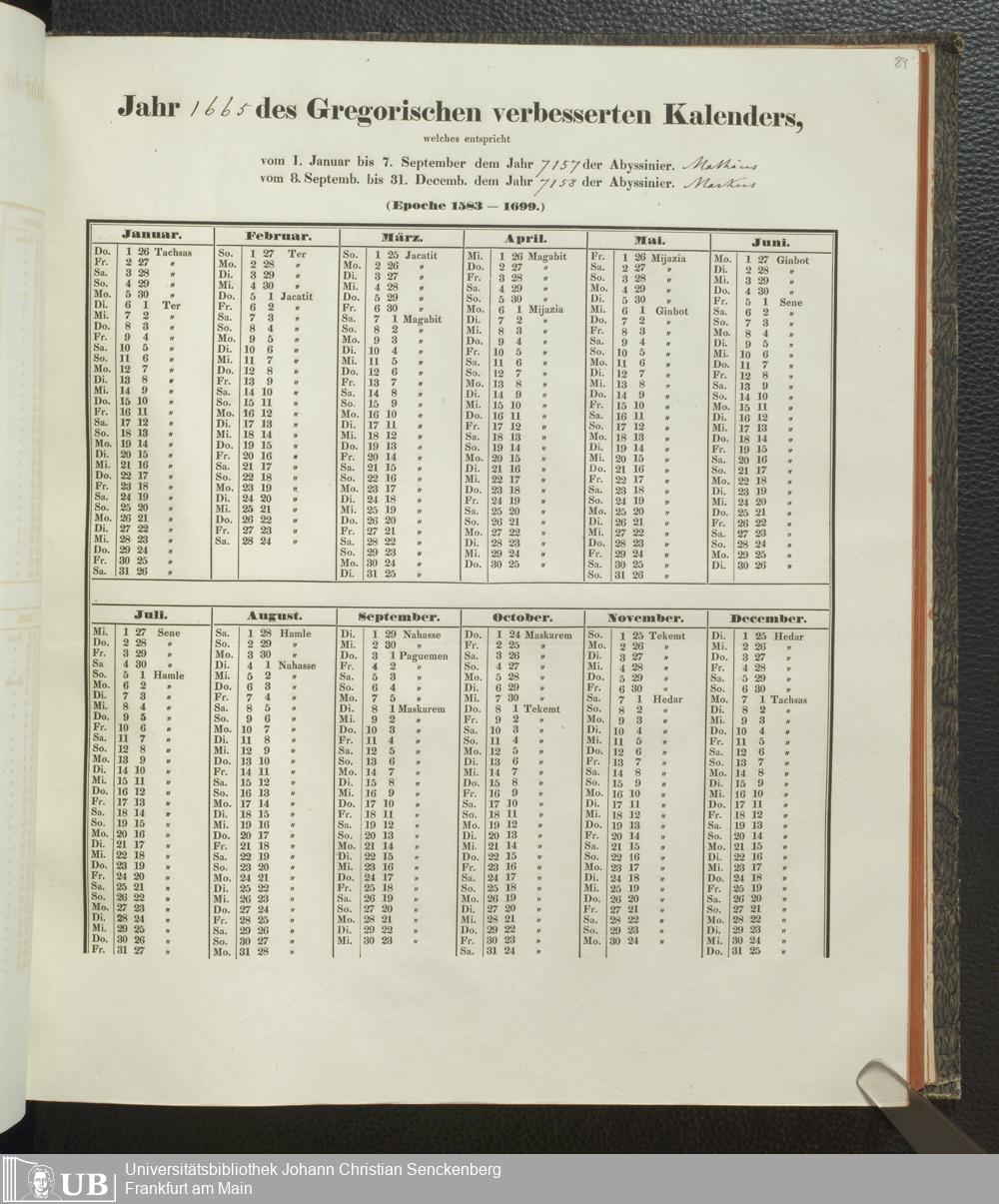 Ms. Ff. E. Rüppell IV - Kalender vom Jahr 1583 bis 1860, das heist seit der Einführung der durch Pabst Gregorius XIII verordneten Verbesserung, aus welchen Kalender die Gleichstellung dieser Zeitrechnung mit der von den Abyssiniern gebräuchlichen Chronologie ersehen werden kann; zum Behuf der geschichtlichen Forschungen der Abyssinischen Chroniken entworfen