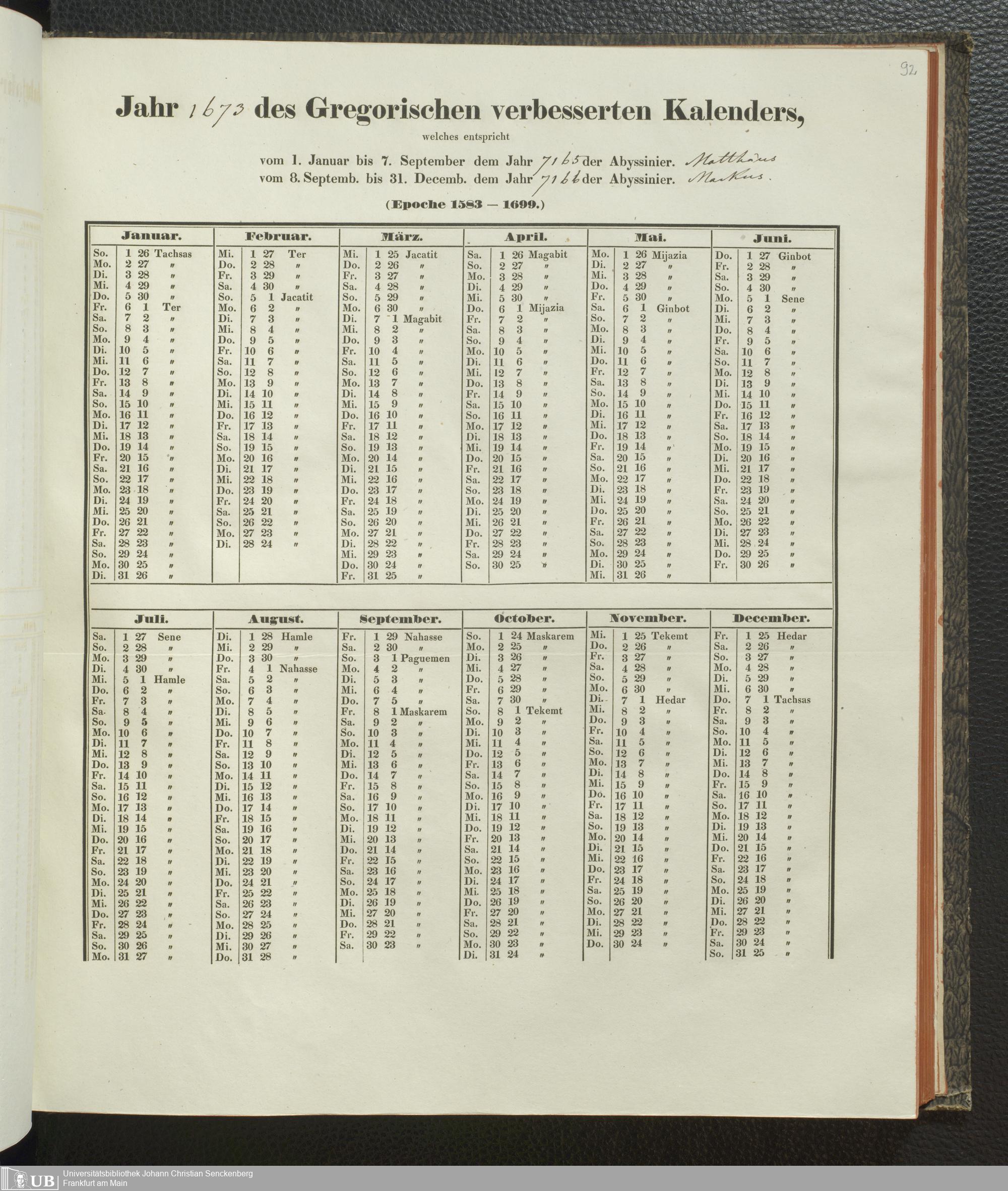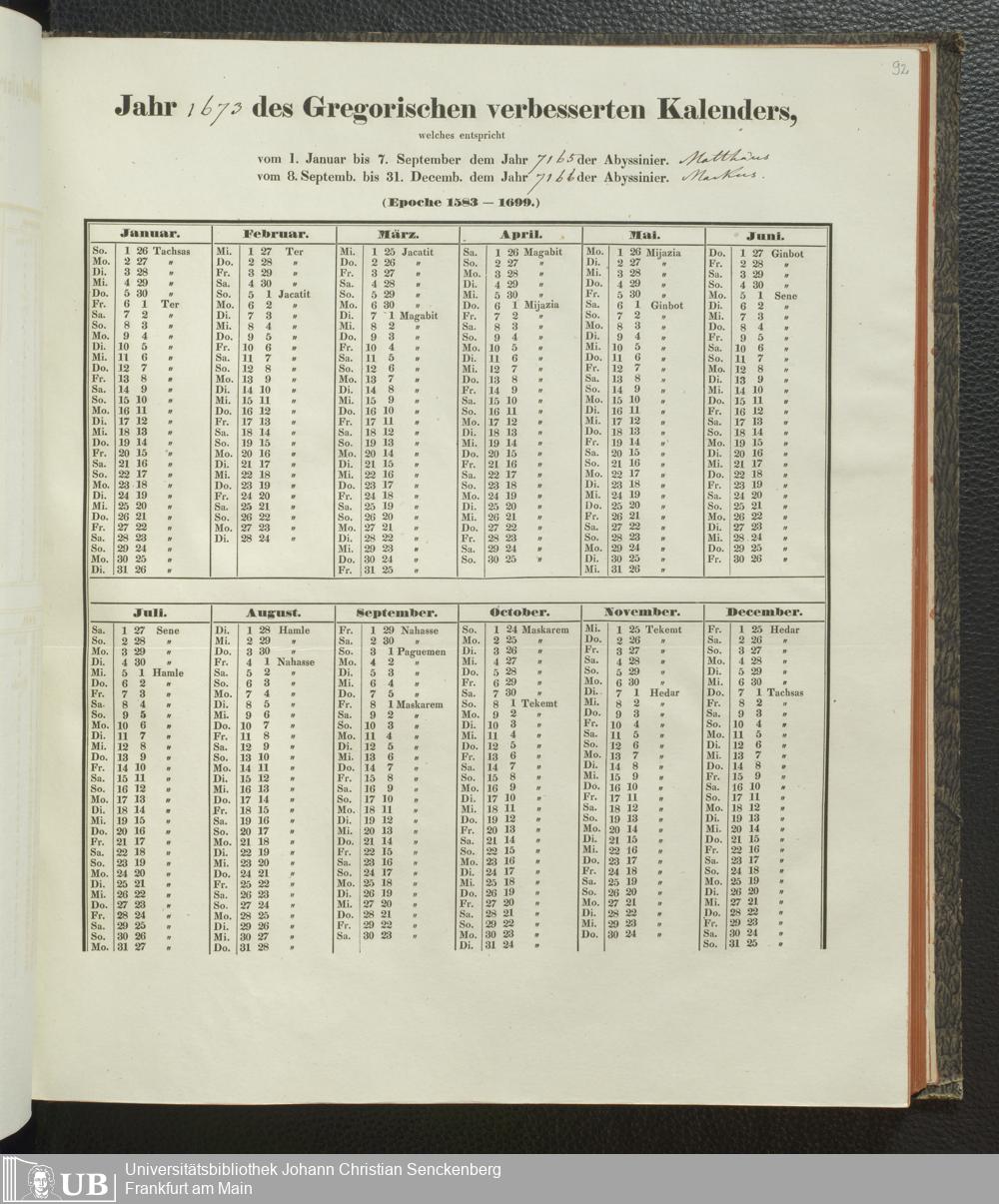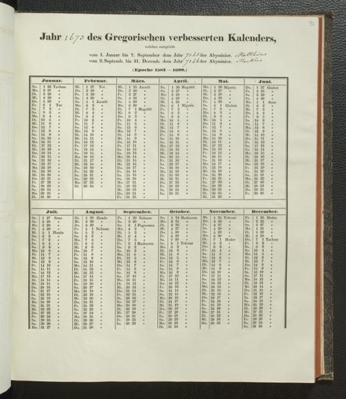 Ms. Ff. E. Rüppell IV - Kalender vom Jahr 1583 bis 1860, das heist seit der Einführung der durch Pabst Gregorius XIII verordneten Verbesserung, aus welchen Kalender die Gleichstellung dieser Zeitrechnung mit der von den Abyssiniern gebräuchlichen Chronologie ersehen werden kann; zum Behuf der geschichtlichen Forschungen der Abyssinischen Chroniken entworfen