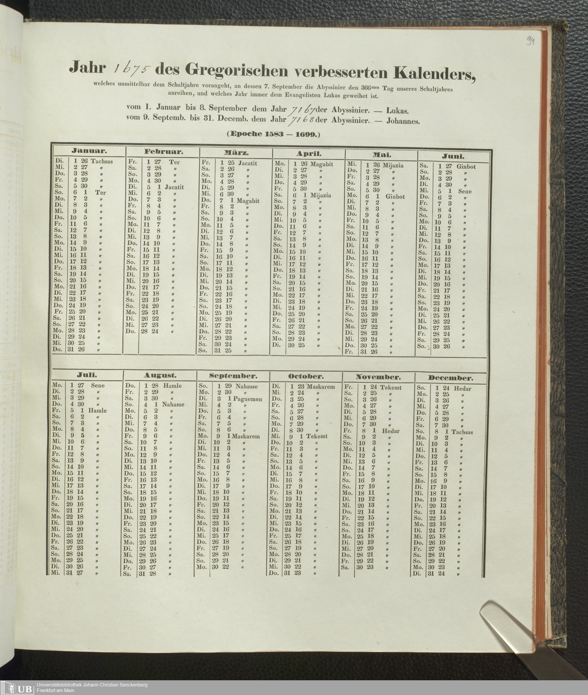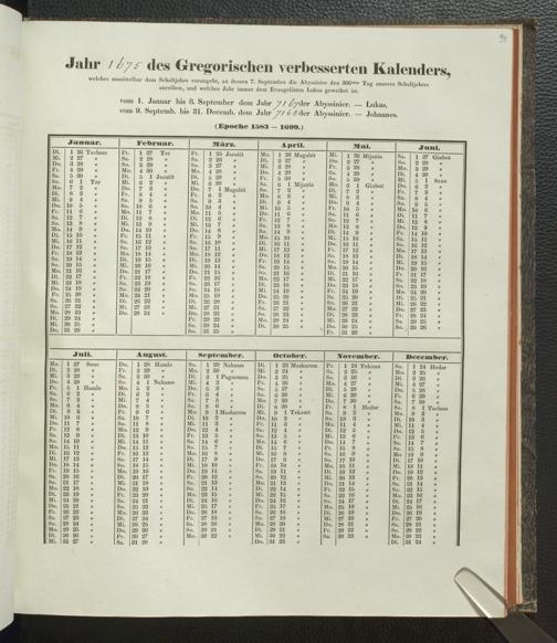 Ms. Ff. E. Rüppell IV - Kalender vom Jahr 1583 bis 1860, das heist seit der Einführung der durch Pabst Gregorius XIII verordneten Verbesserung, aus welchen Kalender die Gleichstellung dieser Zeitrechnung mit der von den Abyssiniern gebräuchlichen Chronologie ersehen werden kann; zum Behuf der geschichtlichen Forschungen der Abyssinischen Chroniken entworfen