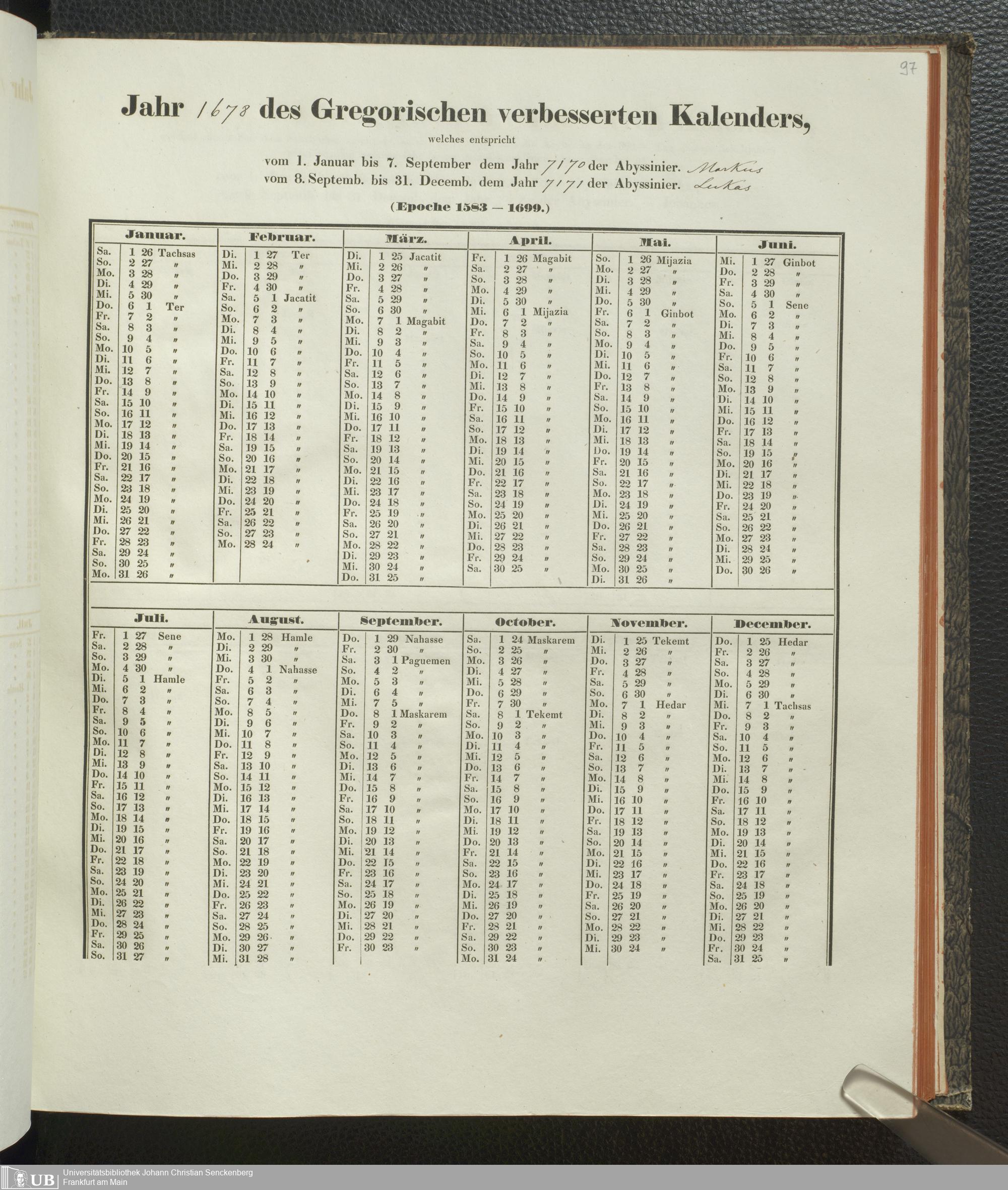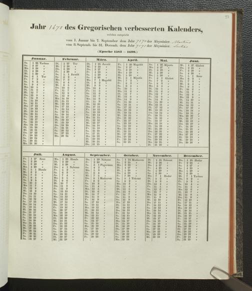 Ms. Ff. E. Rüppell IV - Kalender vom Jahr 1583 bis 1860, das heist seit der Einführung der durch Pabst Gregorius XIII verordneten Verbesserung, aus welchen Kalender die Gleichstellung dieser Zeitrechnung mit der von den Abyssiniern gebräuchlichen Chronologie ersehen werden kann; zum Behuf der geschichtlichen Forschungen der Abyssinischen Chroniken entworfen