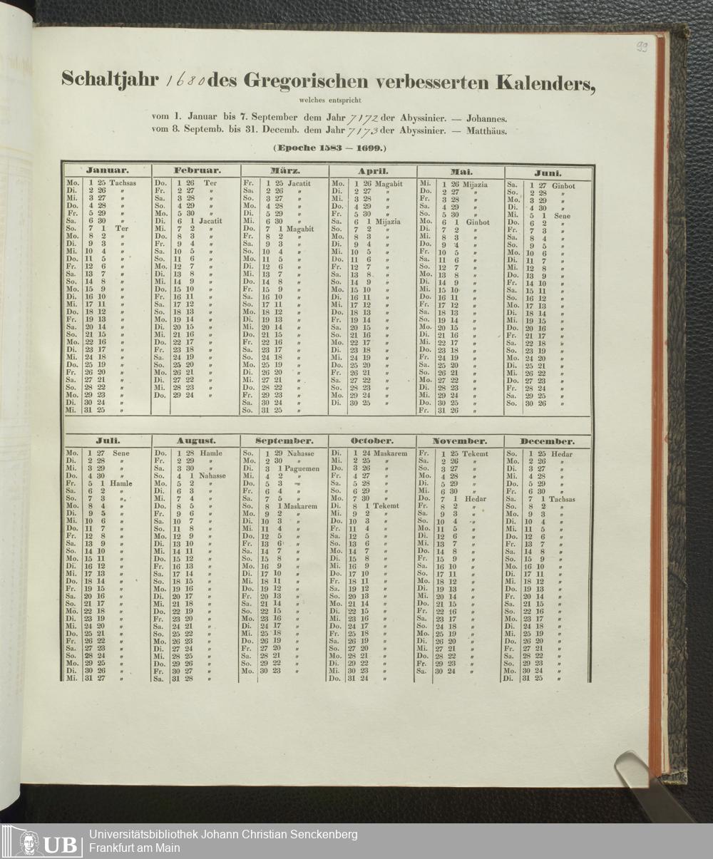 Ms. Ff. E. Rüppell IV - Kalender vom Jahr 1583 bis 1860, das heist seit der Einführung der durch Pabst Gregorius XIII verordneten Verbesserung, aus welchen Kalender die Gleichstellung dieser Zeitrechnung mit der von den Abyssiniern gebräuchlichen Chronologie ersehen werden kann; zum Behuf der geschichtlichen Forschungen der Abyssinischen Chroniken entworfen