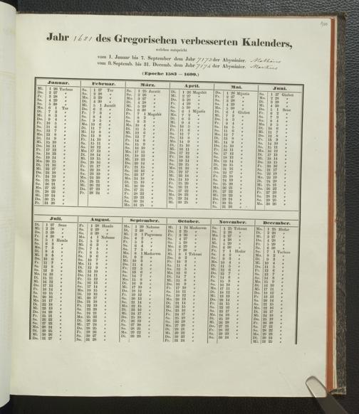 Ms. Ff. E. Rüppell IV - Kalender vom Jahr 1583 bis 1860, das heist seit der Einführung der durch Pabst Gregorius XIII verordneten Verbesserung, aus welchen Kalender die Gleichstellung dieser Zeitrechnung mit der von den Abyssiniern gebräuchlichen Chronologie ersehen werden kann; zum Behuf der geschichtlichen Forschungen der Abyssinischen Chroniken entworfen