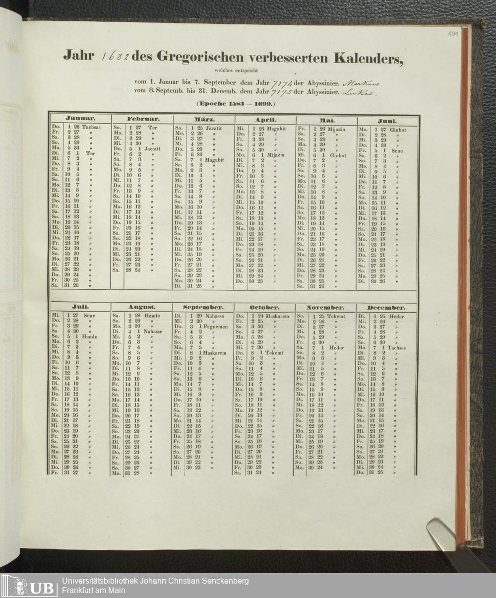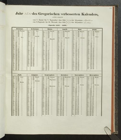 Ms. Ff. E. Rüppell IV - Kalender vom Jahr 1583 bis 1860, das heist seit der Einführung der durch Pabst Gregorius XIII verordneten Verbesserung, aus welchen Kalender die Gleichstellung dieser Zeitrechnung mit der von den Abyssiniern gebräuchlichen Chronologie ersehen werden kann; zum Behuf der geschichtlichen Forschungen der Abyssinischen Chroniken entworfen