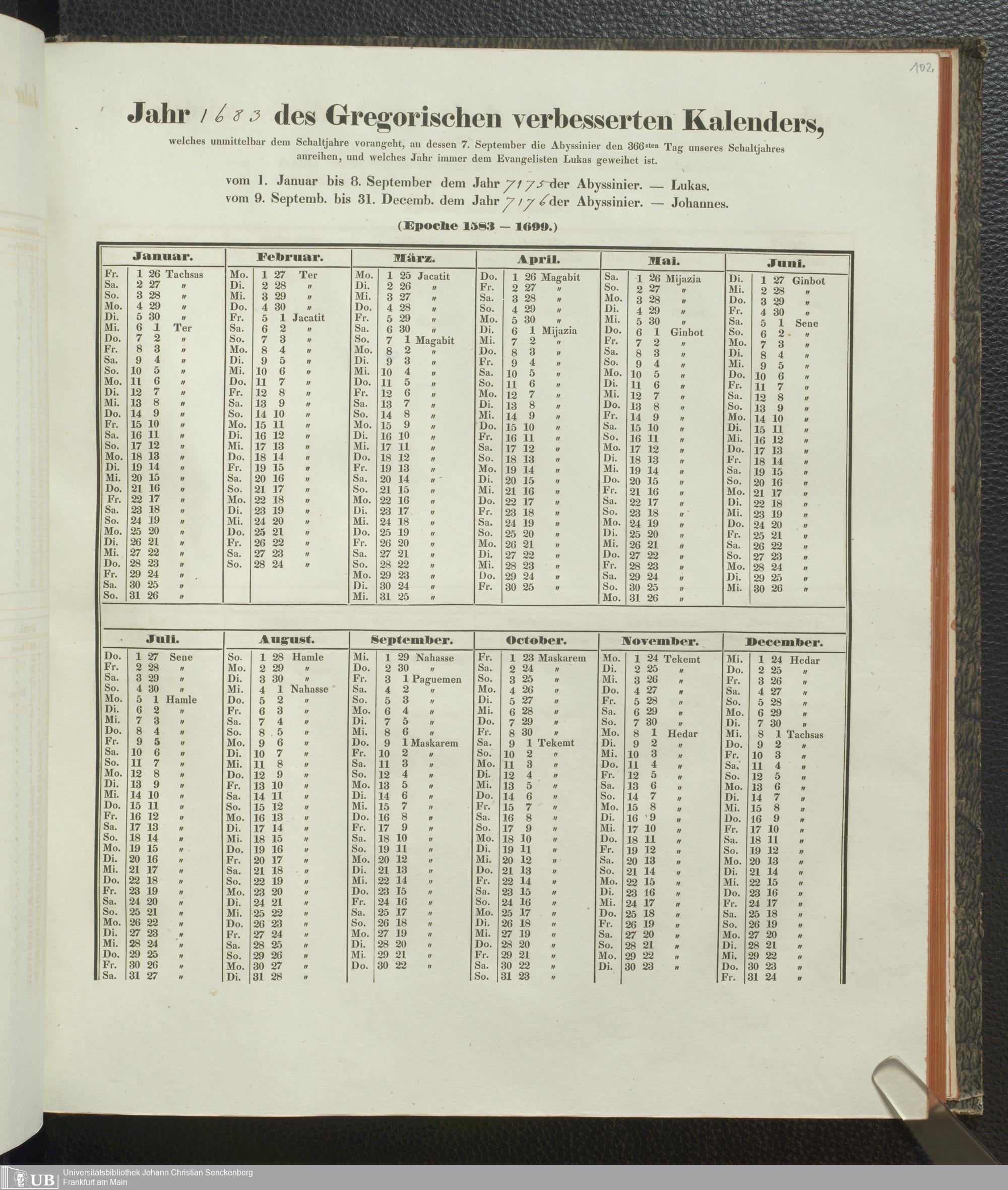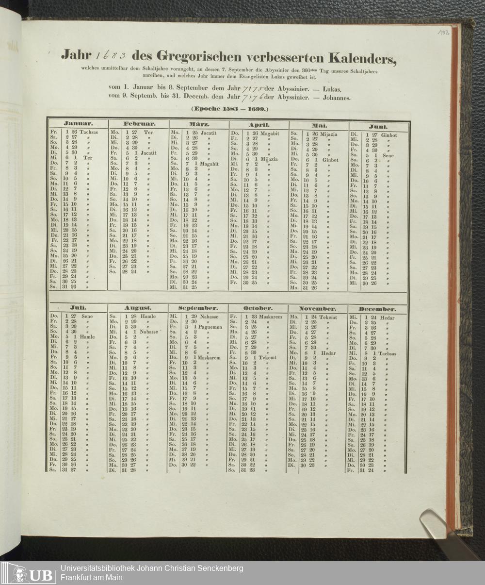 Ms. Ff. E. Rüppell IV - Kalender vom Jahr 1583 bis 1860, das heist seit der Einführung der durch Pabst Gregorius XIII verordneten Verbesserung, aus welchen Kalender die Gleichstellung dieser Zeitrechnung mit der von den Abyssiniern gebräuchlichen Chronologie ersehen werden kann; zum Behuf der geschichtlichen Forschungen der Abyssinischen Chroniken entworfen