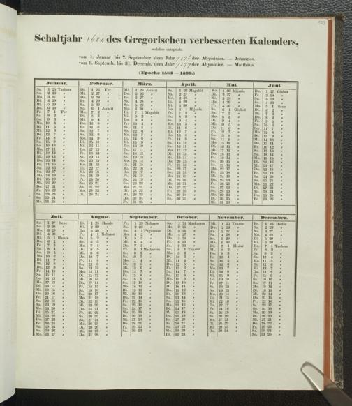 Ms. Ff. E. Rüppell IV - Kalender vom Jahr 1583 bis 1860, das heist seit der Einführung der durch Pabst Gregorius XIII verordneten Verbesserung, aus welchen Kalender die Gleichstellung dieser Zeitrechnung mit der von den Abyssiniern gebräuchlichen Chronologie ersehen werden kann; zum Behuf der geschichtlichen Forschungen der Abyssinischen Chroniken entworfen