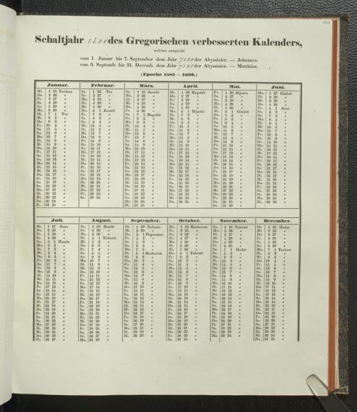 Ms. Ff. E. Rüppell IV - Kalender vom Jahr 1583 bis 1860, das heist seit der Einführung der durch Pabst Gregorius XIII verordneten Verbesserung, aus welchen Kalender die Gleichstellung dieser Zeitrechnung mit der von den Abyssiniern gebräuchlichen Chronologie ersehen werden kann; zum Behuf der geschichtlichen Forschungen der Abyssinischen Chroniken entworfen