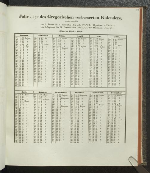 Ms. Ff. E. Rüppell IV - Kalender vom Jahr 1583 bis 1860, das heist seit der Einführung der durch Pabst Gregorius XIII verordneten Verbesserung, aus welchen Kalender die Gleichstellung dieser Zeitrechnung mit der von den Abyssiniern gebräuchlichen Chronologie ersehen werden kann; zum Behuf der geschichtlichen Forschungen der Abyssinischen Chroniken entworfen