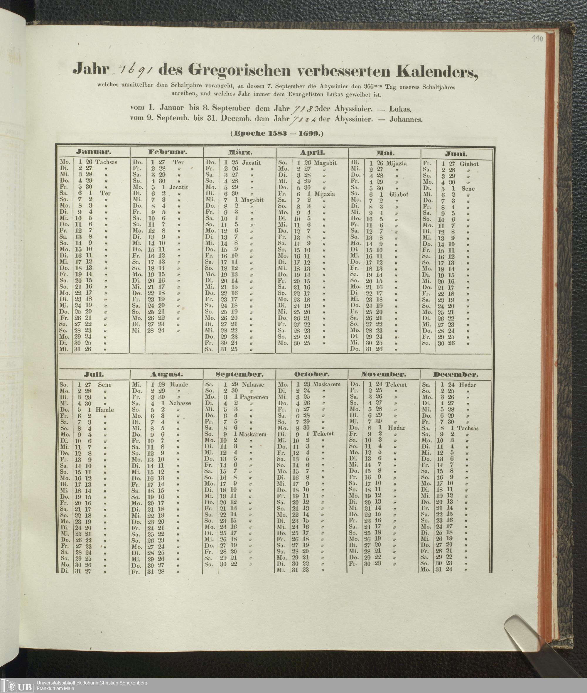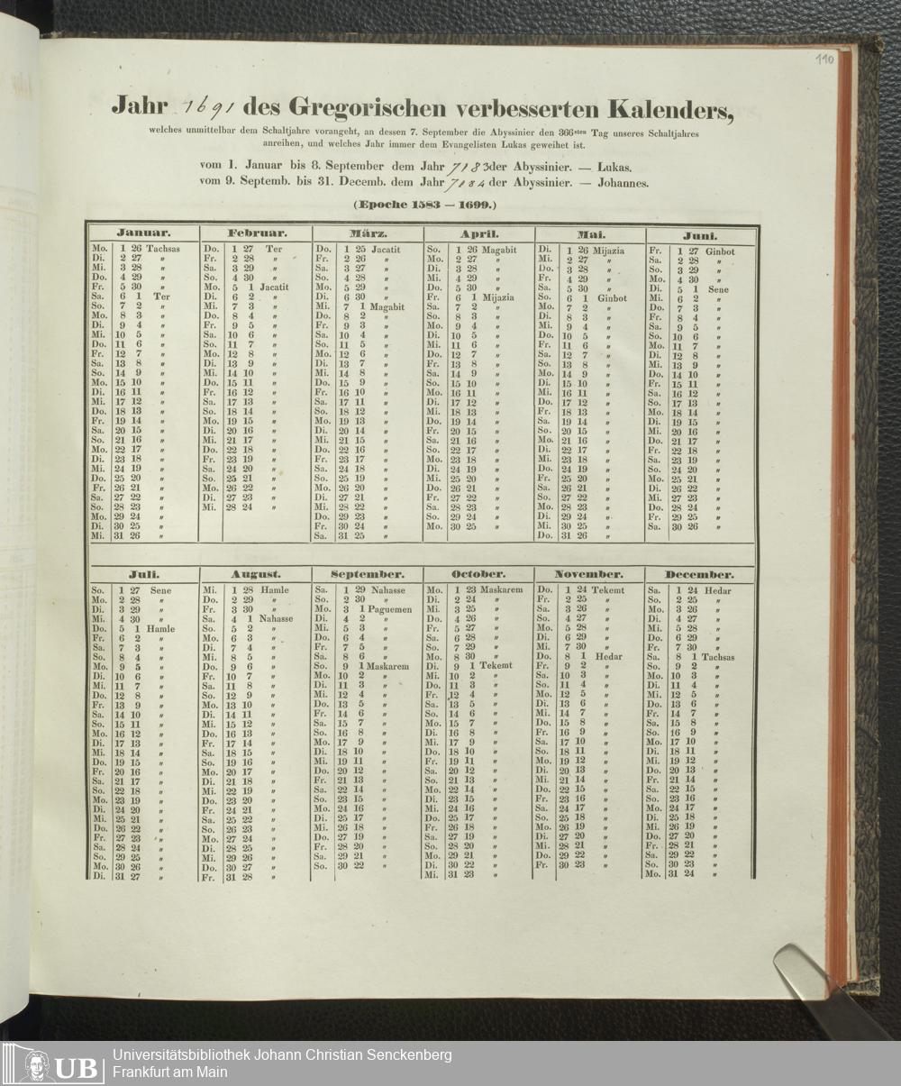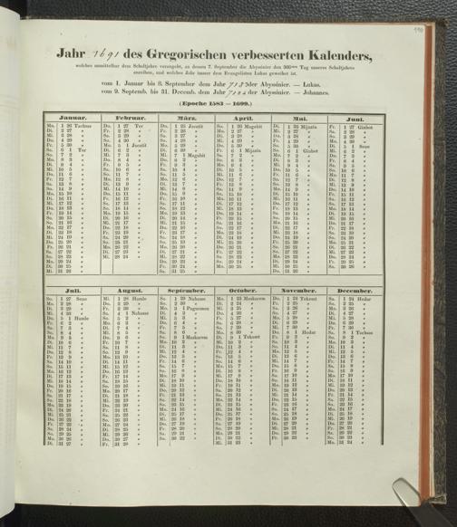 Ms. Ff. E. Rüppell IV - Kalender vom Jahr 1583 bis 1860, das heist seit der Einführung der durch Pabst Gregorius XIII verordneten Verbesserung, aus welchen Kalender die Gleichstellung dieser Zeitrechnung mit der von den Abyssiniern gebräuchlichen Chronologie ersehen werden kann; zum Behuf der geschichtlichen Forschungen der Abyssinischen Chroniken entworfen