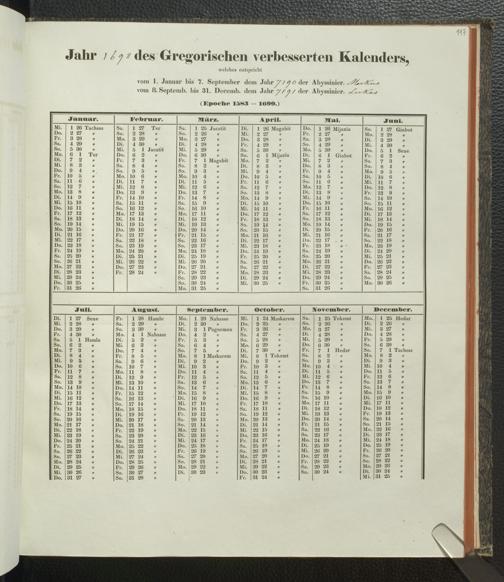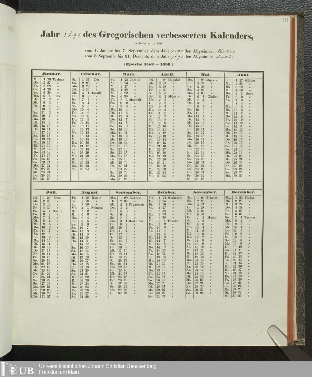 Ms. Ff. E. Rüppell IV - Kalender vom Jahr 1583 bis 1860, das heist seit der Einführung der durch Pabst Gregorius XIII verordneten Verbesserung, aus welchen Kalender die Gleichstellung dieser Zeitrechnung mit der von den Abyssiniern gebräuchlichen Chronologie ersehen werden kann; zum Behuf der geschichtlichen Forschungen der Abyssinischen Chroniken entworfen