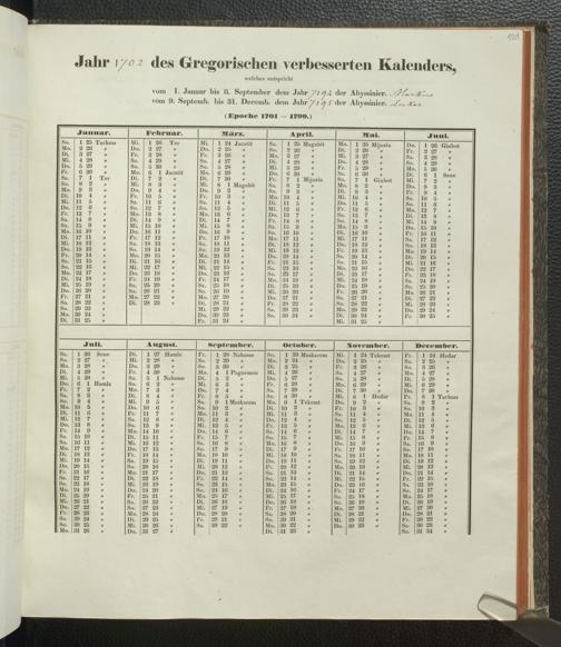 Ms. Ff. E. Rüppell IV - Kalender vom Jahr 1583 bis 1860, das heist seit der Einführung der durch Pabst Gregorius XIII verordneten Verbesserung, aus welchen Kalender die Gleichstellung dieser Zeitrechnung mit der von den Abyssiniern gebräuchlichen Chronologie ersehen werden kann; zum Behuf der geschichtlichen Forschungen der Abyssinischen Chroniken entworfen