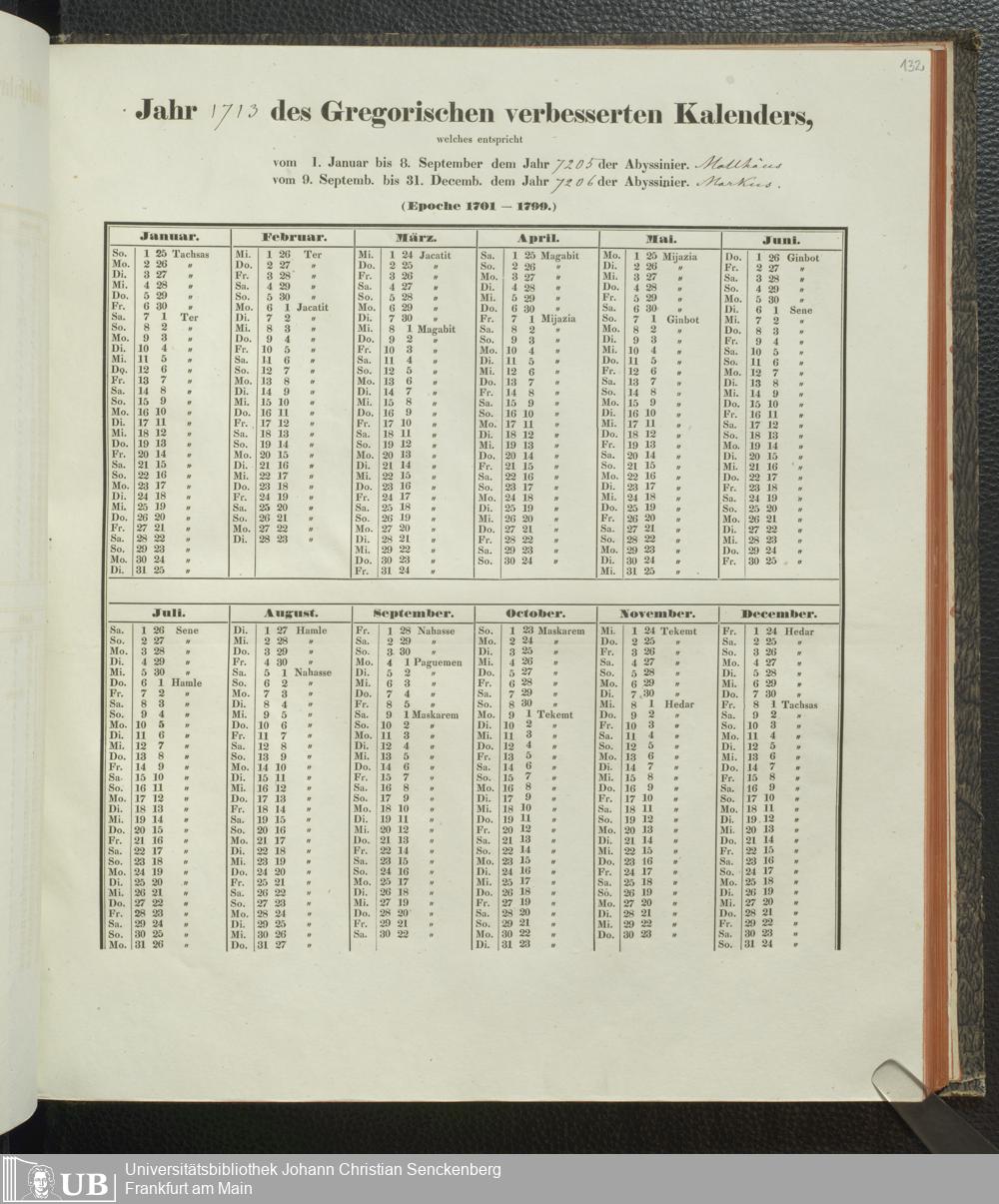 Ms. Ff. E. Rüppell IV - Kalender vom Jahr 1583 bis 1860, das heist seit der Einführung der durch Pabst Gregorius XIII verordneten Verbesserung, aus welchen Kalender die Gleichstellung dieser Zeitrechnung mit der von den Abyssiniern gebräuchlichen Chronologie ersehen werden kann; zum Behuf der geschichtlichen Forschungen der Abyssinischen Chroniken entworfen
