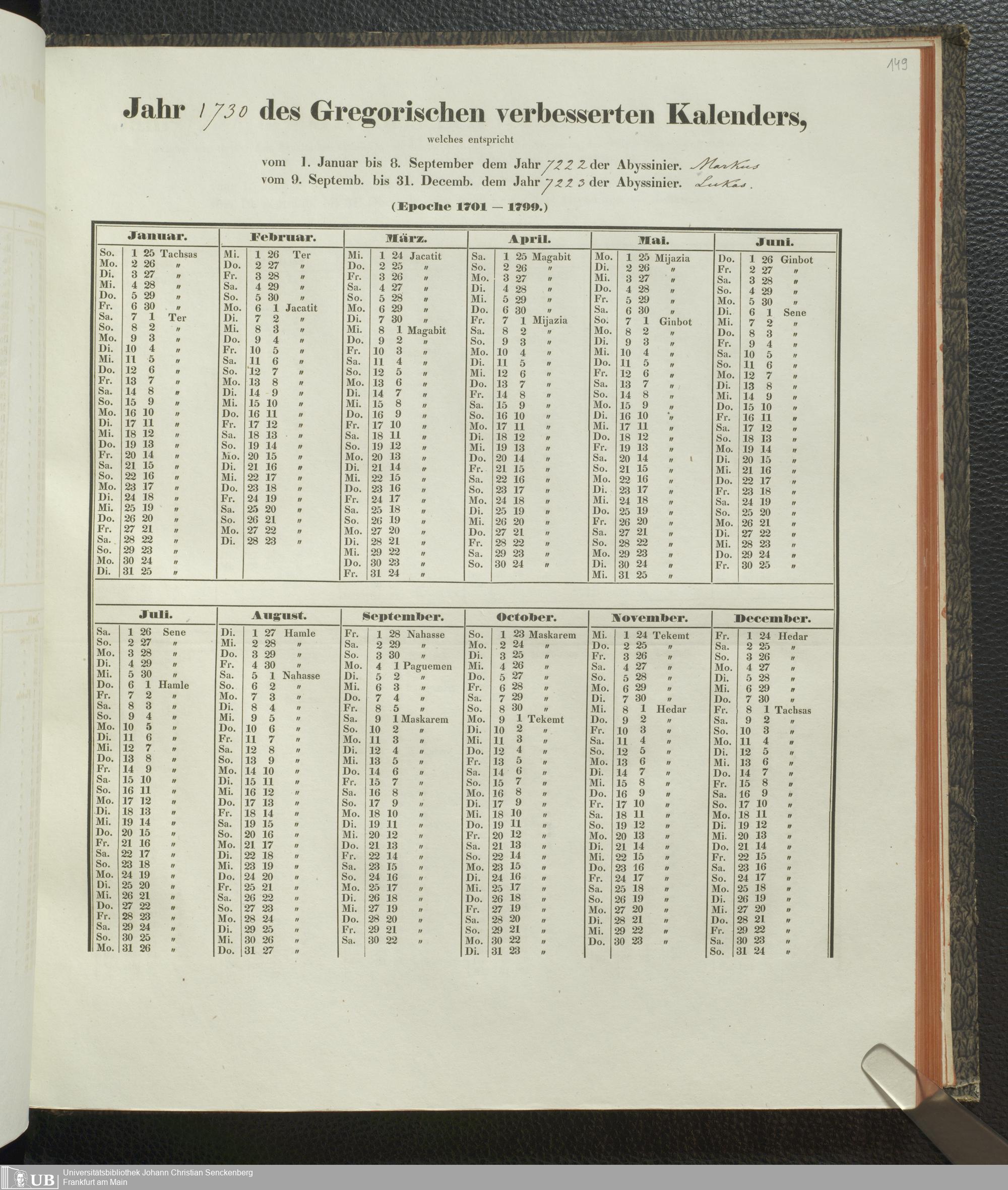 Ms. Ff. E. Rüppell IV - Kalender vom Jahr 1583 bis 1860, das heist seit der Einführung der durch Pabst Gregorius XIII verordneten Verbesserung, aus welchen Kalender die Gleichstellung dieser Zeitrechnung mit der von den Abyssiniern gebräuchlichen Chronologie ersehen werden kann; zum Behuf der geschichtlichen Forschungen der Abyssinischen Chroniken entworfen