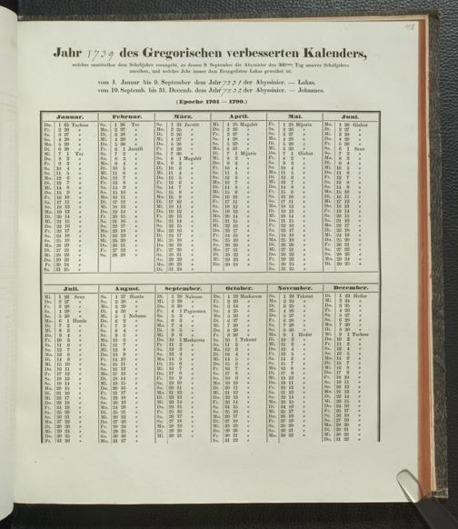 Ms. Ff. E. Rüppell IV - Kalender vom Jahr 1583 bis 1860, das heist seit der Einführung der durch Pabst Gregorius XIII verordneten Verbesserung, aus welchen Kalender die Gleichstellung dieser Zeitrechnung mit der von den Abyssiniern gebräuchlichen Chronologie ersehen werden kann; zum Behuf der geschichtlichen Forschungen der Abyssinischen Chroniken entworfen