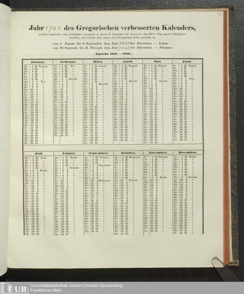 Ms. Ff. E. Rüppell IV - Kalender vom Jahr 1583 bis 1860, das heist seit der Einführung der durch Pabst Gregorius XIII verordneten Verbesserung, aus welchen Kalender die Gleichstellung dieser Zeitrechnung mit der von den Abyssiniern gebräuchlichen Chronologie ersehen werden kann; zum Behuf der geschichtlichen Forschungen der Abyssinischen Chroniken entworfen