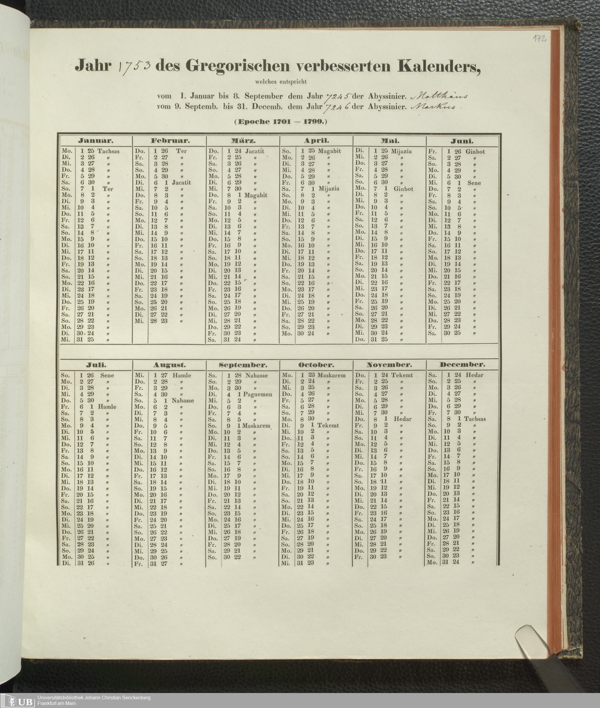 Ms. Ff. E. Rüppell IV - Kalender vom Jahr 1583 bis 1860, das heist seit der Einführung der durch Pabst Gregorius XIII verordneten Verbesserung, aus welchen Kalender die Gleichstellung dieser Zeitrechnung mit der von den Abyssiniern gebräuchlichen Chronologie ersehen werden kann; zum Behuf der geschichtlichen Forschungen der Abyssinischen Chroniken entworfen