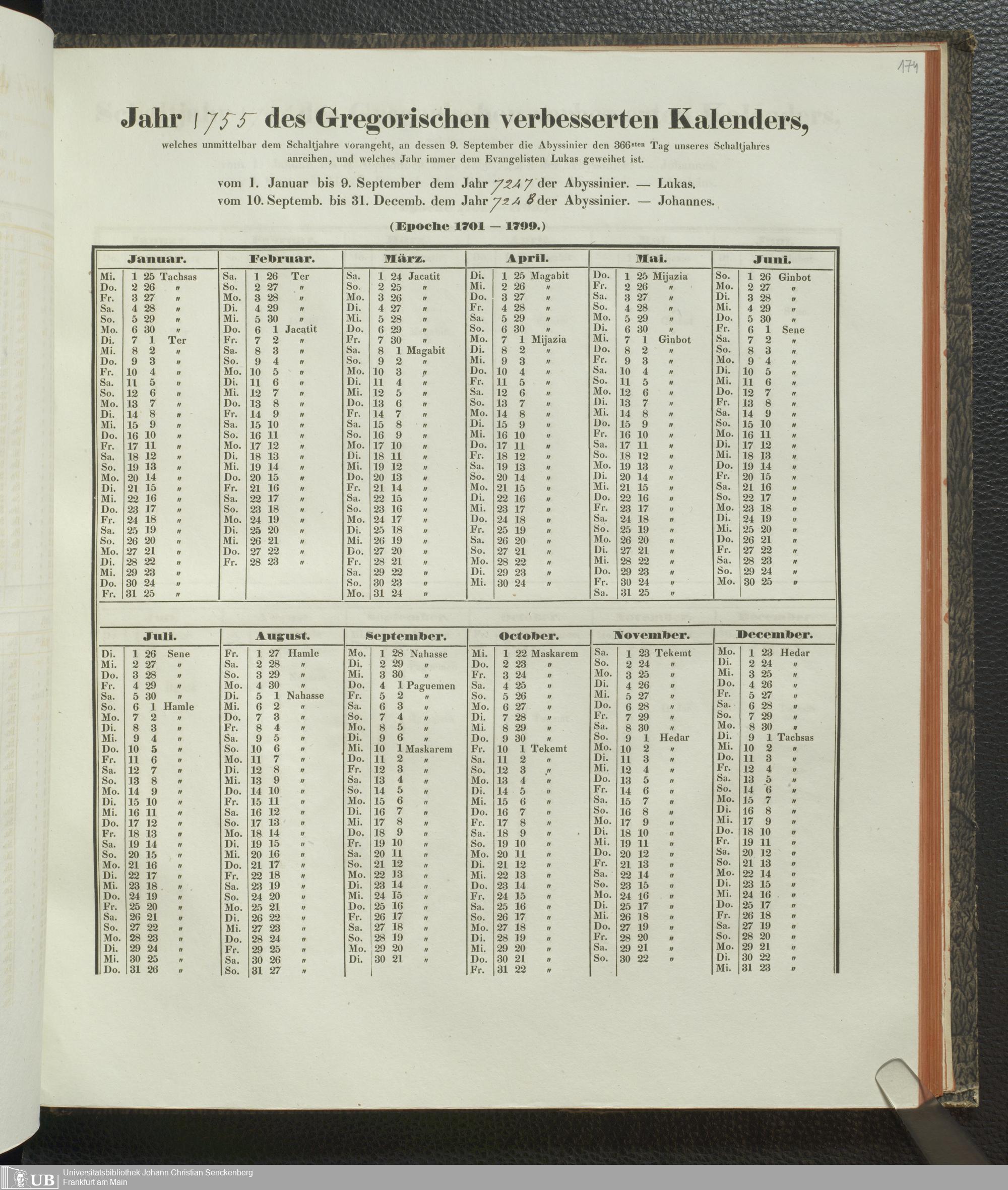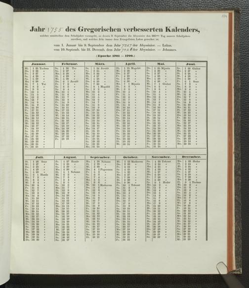 Ms. Ff. E. Rüppell IV - Kalender vom Jahr 1583 bis 1860, das heist seit der Einführung der durch Pabst Gregorius XIII verordneten Verbesserung, aus welchen Kalender die Gleichstellung dieser Zeitrechnung mit der von den Abyssiniern gebräuchlichen Chronologie ersehen werden kann; zum Behuf der geschichtlichen Forschungen der Abyssinischen Chroniken entworfen