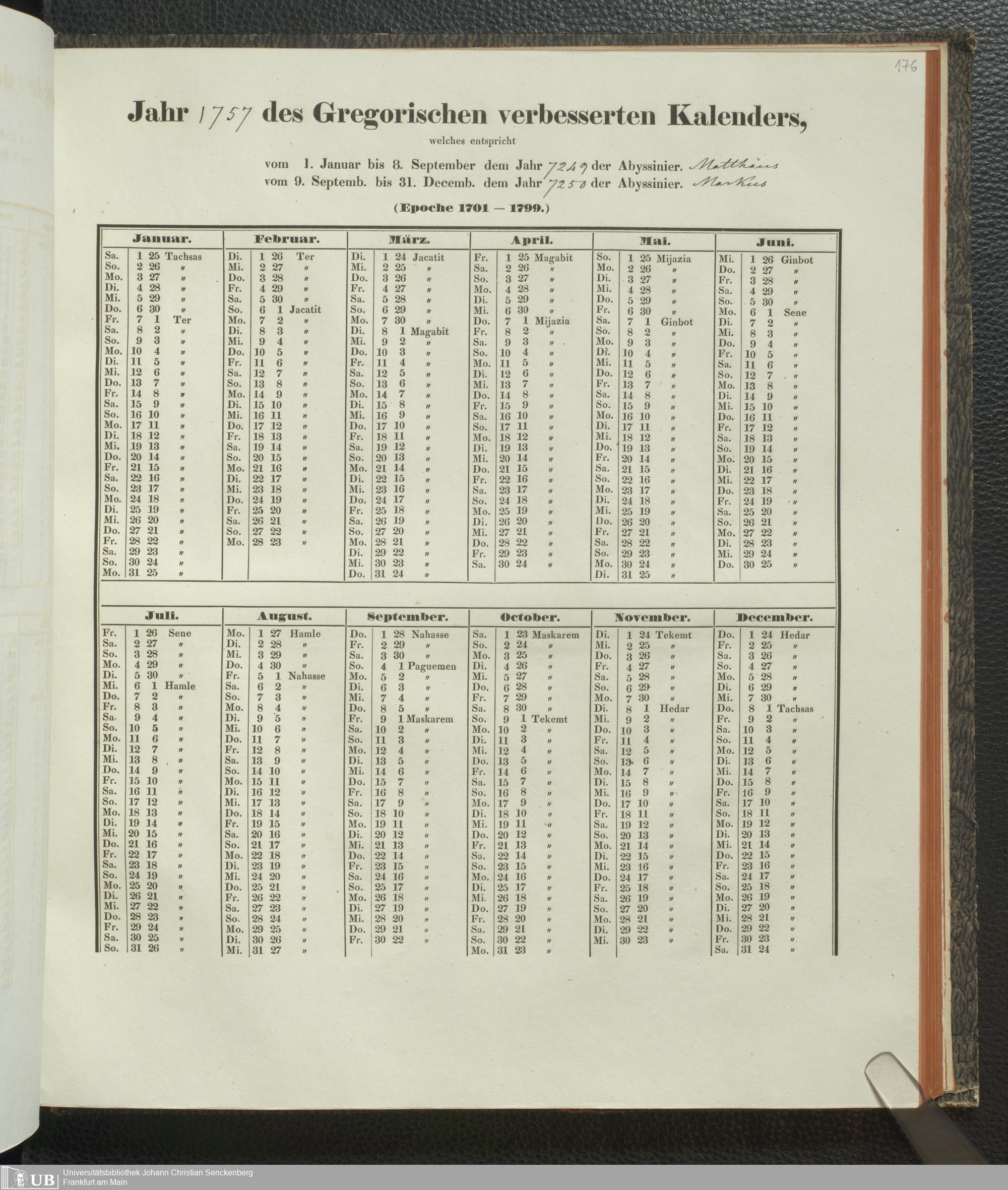 Ms. Ff. E. Rüppell IV - Kalender vom Jahr 1583 bis 1860, das heist seit der Einführung der durch Pabst Gregorius XIII verordneten Verbesserung, aus welchen Kalender die Gleichstellung dieser Zeitrechnung mit der von den Abyssiniern gebräuchlichen Chronologie ersehen werden kann; zum Behuf der geschichtlichen Forschungen der Abyssinischen Chroniken entworfen