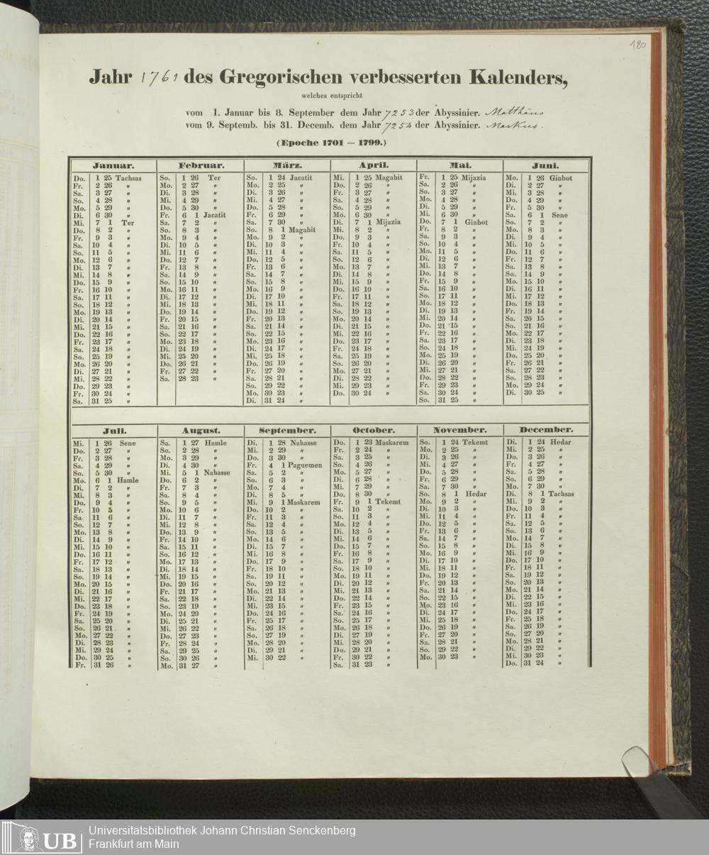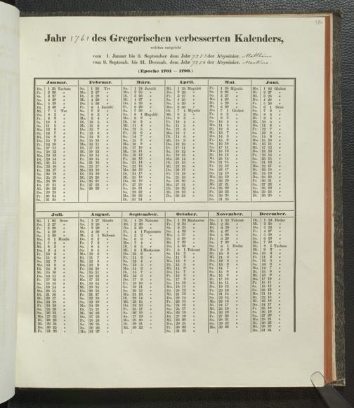 Ms. Ff. E. Rüppell IV - Kalender vom Jahr 1583 bis 1860, das heist seit der Einführung der durch Pabst Gregorius XIII verordneten Verbesserung, aus welchen Kalender die Gleichstellung dieser Zeitrechnung mit der von den Abyssiniern gebräuchlichen Chronologie ersehen werden kann; zum Behuf der geschichtlichen Forschungen der Abyssinischen Chroniken entworfen