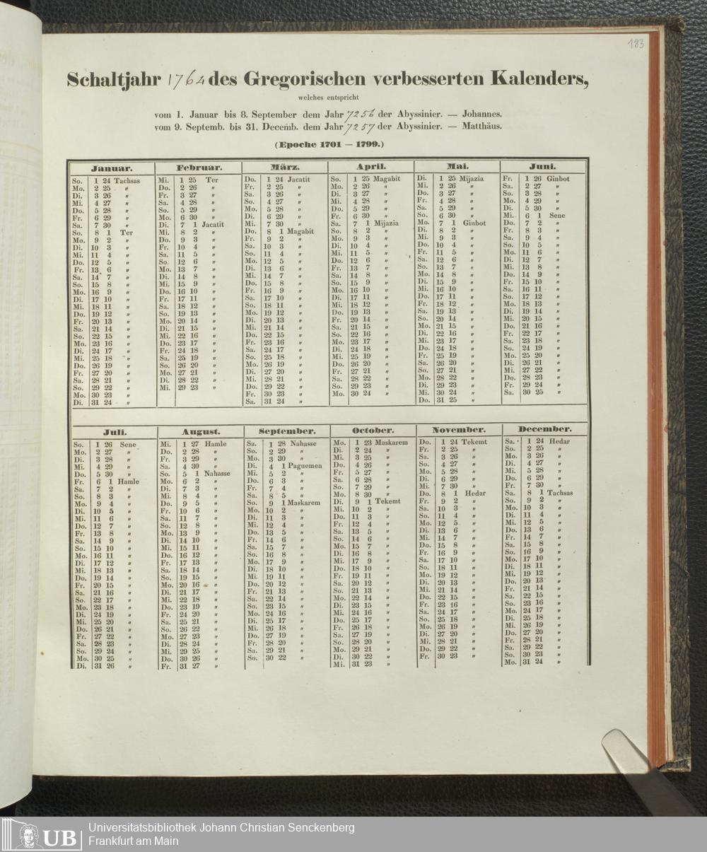 Ms. Ff. E. Rüppell IV - Kalender vom Jahr 1583 bis 1860, das heist seit der Einführung der durch Pabst Gregorius XIII verordneten Verbesserung, aus welchen Kalender die Gleichstellung dieser Zeitrechnung mit der von den Abyssiniern gebräuchlichen Chronologie ersehen werden kann; zum Behuf der geschichtlichen Forschungen der Abyssinischen Chroniken entworfen