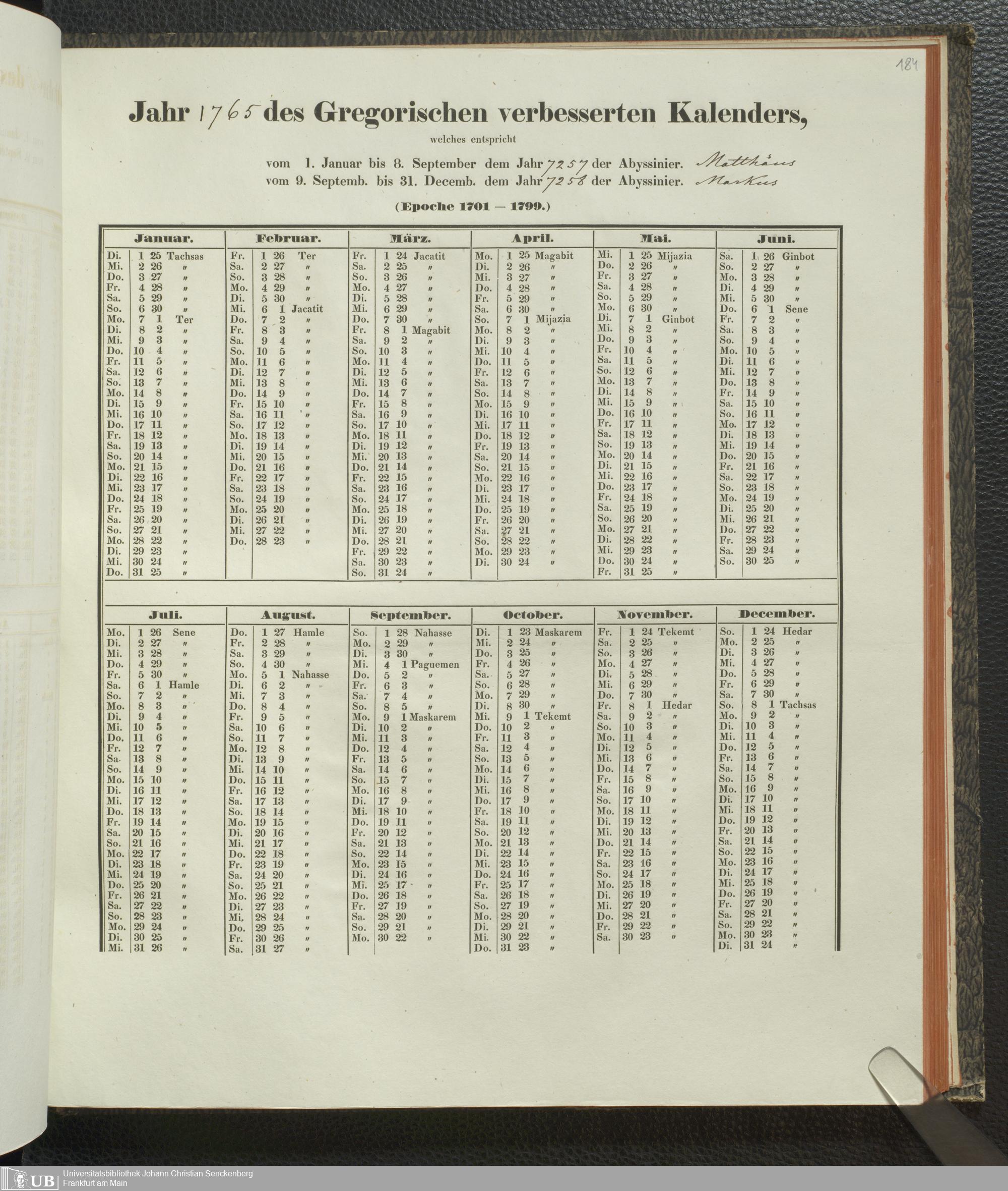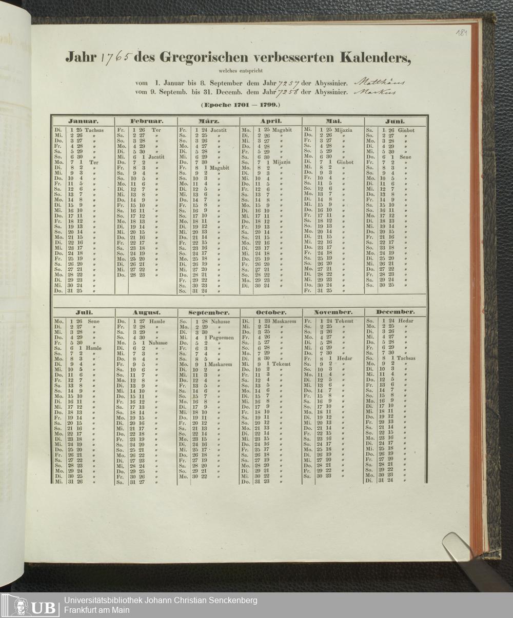 Ms. Ff. E. Rüppell IV - Kalender vom Jahr 1583 bis 1860, das heist seit der Einführung der durch Pabst Gregorius XIII verordneten Verbesserung, aus welchen Kalender die Gleichstellung dieser Zeitrechnung mit der von den Abyssiniern gebräuchlichen Chronologie ersehen werden kann; zum Behuf der geschichtlichen Forschungen der Abyssinischen Chroniken entworfen