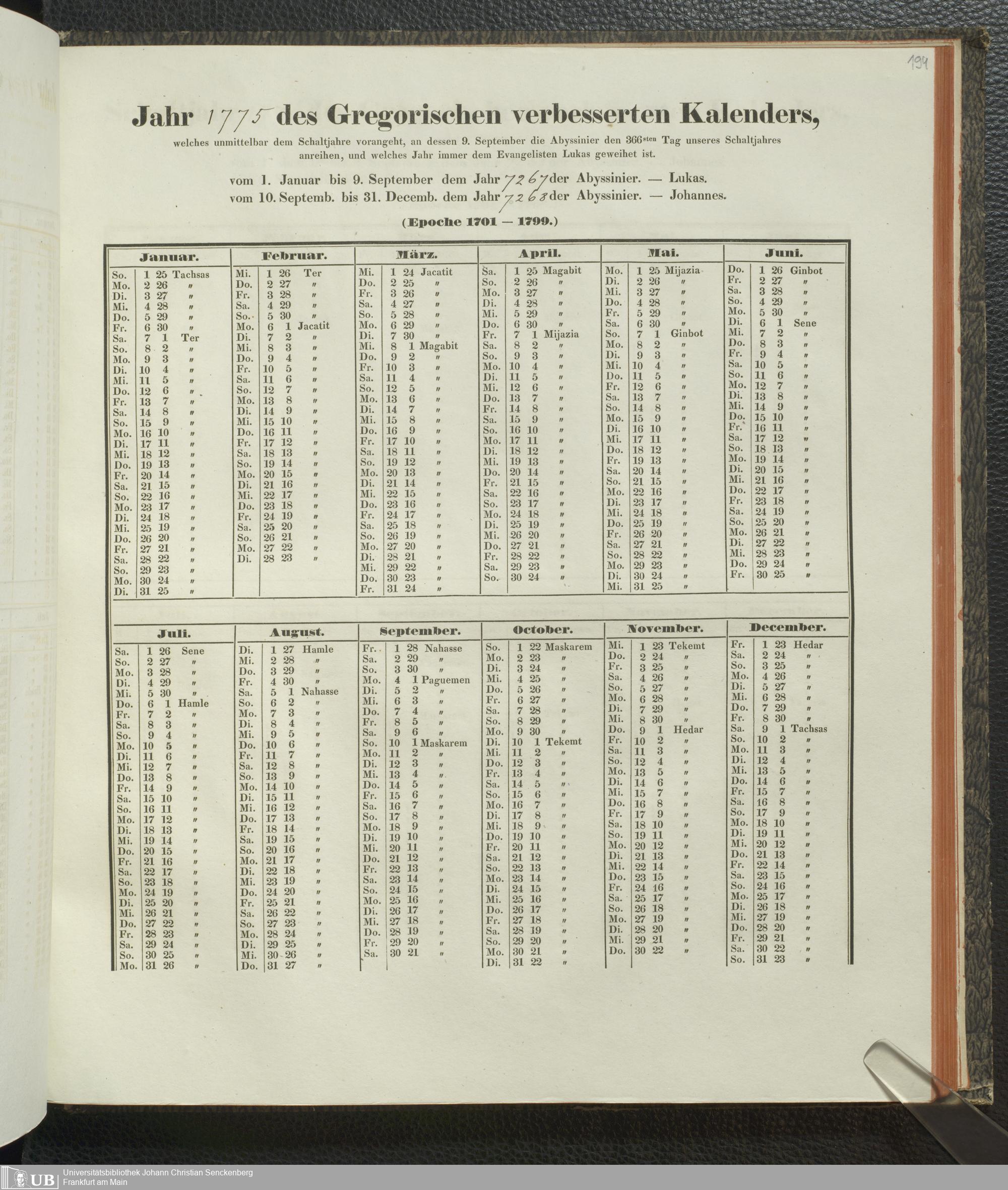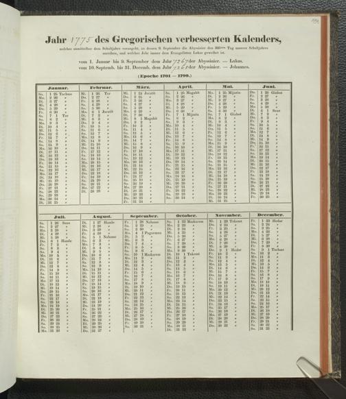 Ms. Ff. E. Rüppell IV - Kalender vom Jahr 1583 bis 1860, das heist seit der Einführung der durch Pabst Gregorius XIII verordneten Verbesserung, aus welchen Kalender die Gleichstellung dieser Zeitrechnung mit der von den Abyssiniern gebräuchlichen Chronologie ersehen werden kann; zum Behuf der geschichtlichen Forschungen der Abyssinischen Chroniken entworfen