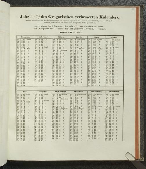 Ms. Ff. E. Rüppell IV - Kalender vom Jahr 1583 bis 1860, das heist seit der Einführung der durch Pabst Gregorius XIII verordneten Verbesserung, aus welchen Kalender die Gleichstellung dieser Zeitrechnung mit der von den Abyssiniern gebräuchlichen Chronologie ersehen werden kann; zum Behuf der geschichtlichen Forschungen der Abyssinischen Chroniken entworfen