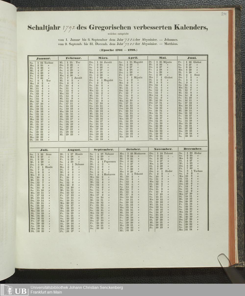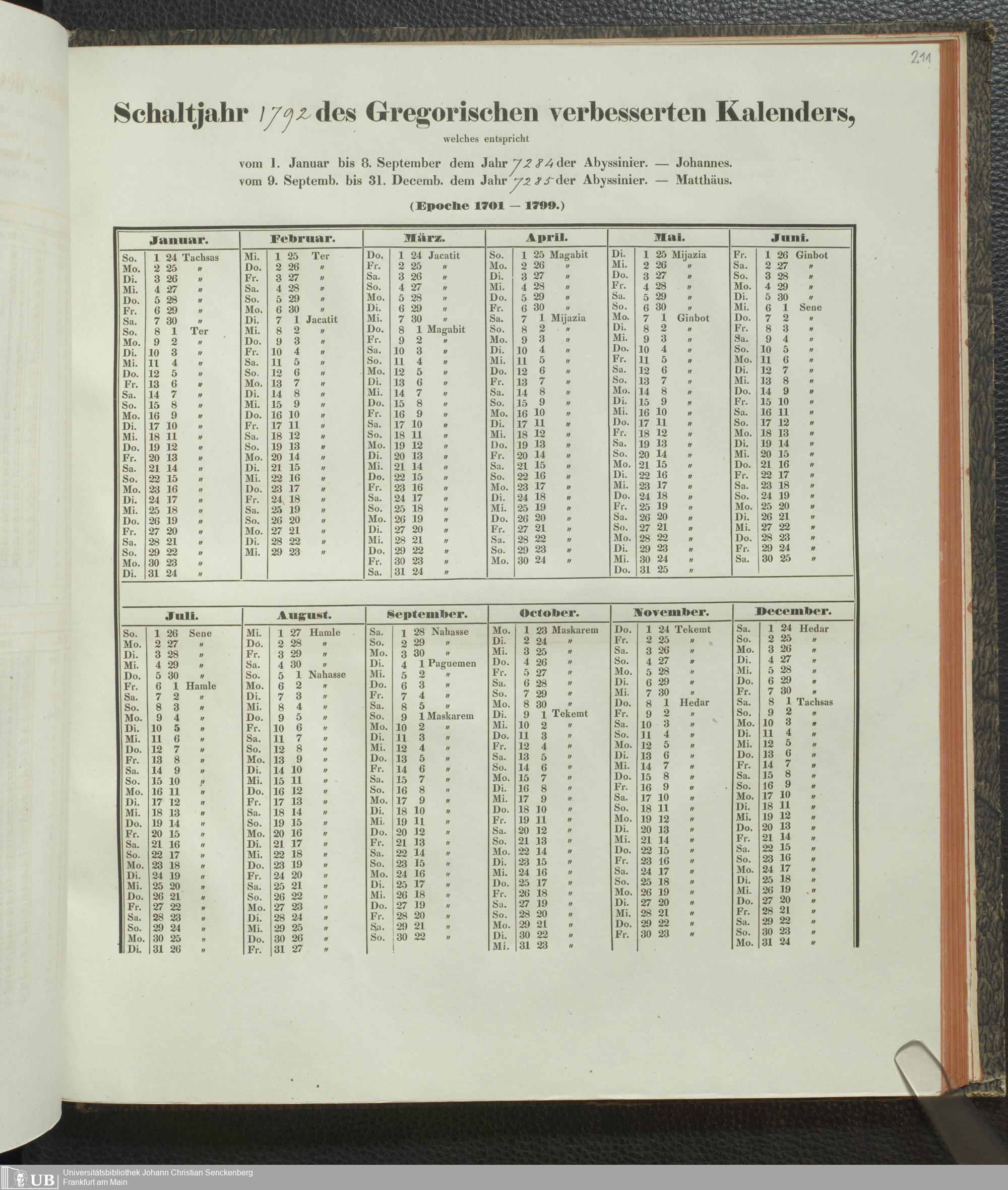 Ms. Ff. E. Rüppell IV - Kalender vom Jahr 1583 bis 1860, das heist seit der Einführung der durch Pabst Gregorius XIII verordneten Verbesserung, aus welchen Kalender die Gleichstellung dieser Zeitrechnung mit der von den Abyssiniern gebräuchlichen Chronologie ersehen werden kann; zum Behuf der geschichtlichen Forschungen der Abyssinischen Chroniken entworfen