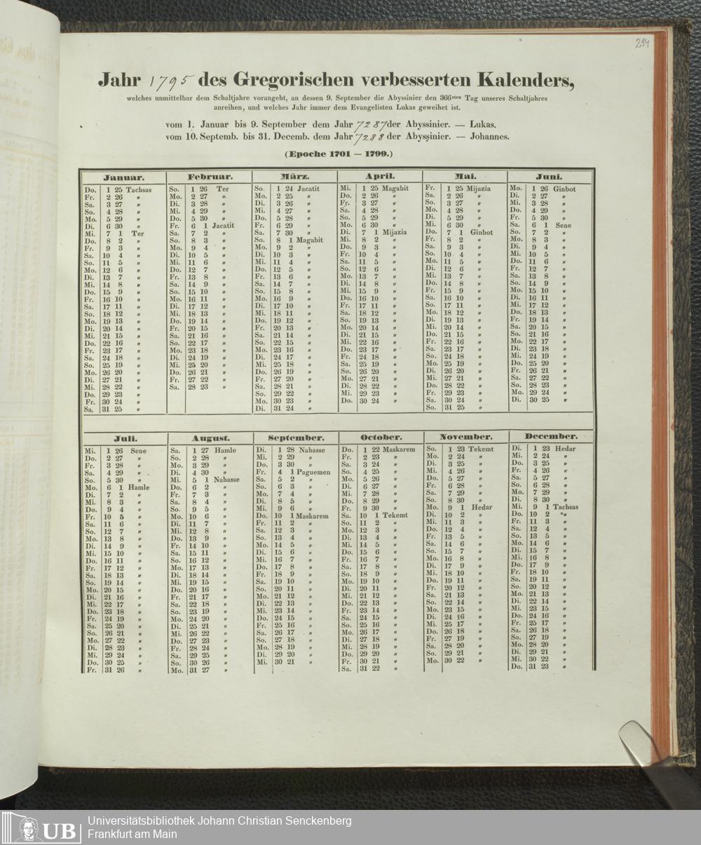 Ms. Ff. E. Rüppell IV - Kalender vom Jahr 1583 bis 1860, das heist seit der Einführung der durch Pabst Gregorius XIII verordneten Verbesserung, aus welchen Kalender die Gleichstellung dieser Zeitrechnung mit der von den Abyssiniern gebräuchlichen Chronologie ersehen werden kann; zum Behuf der geschichtlichen Forschungen der Abyssinischen Chroniken entworfen