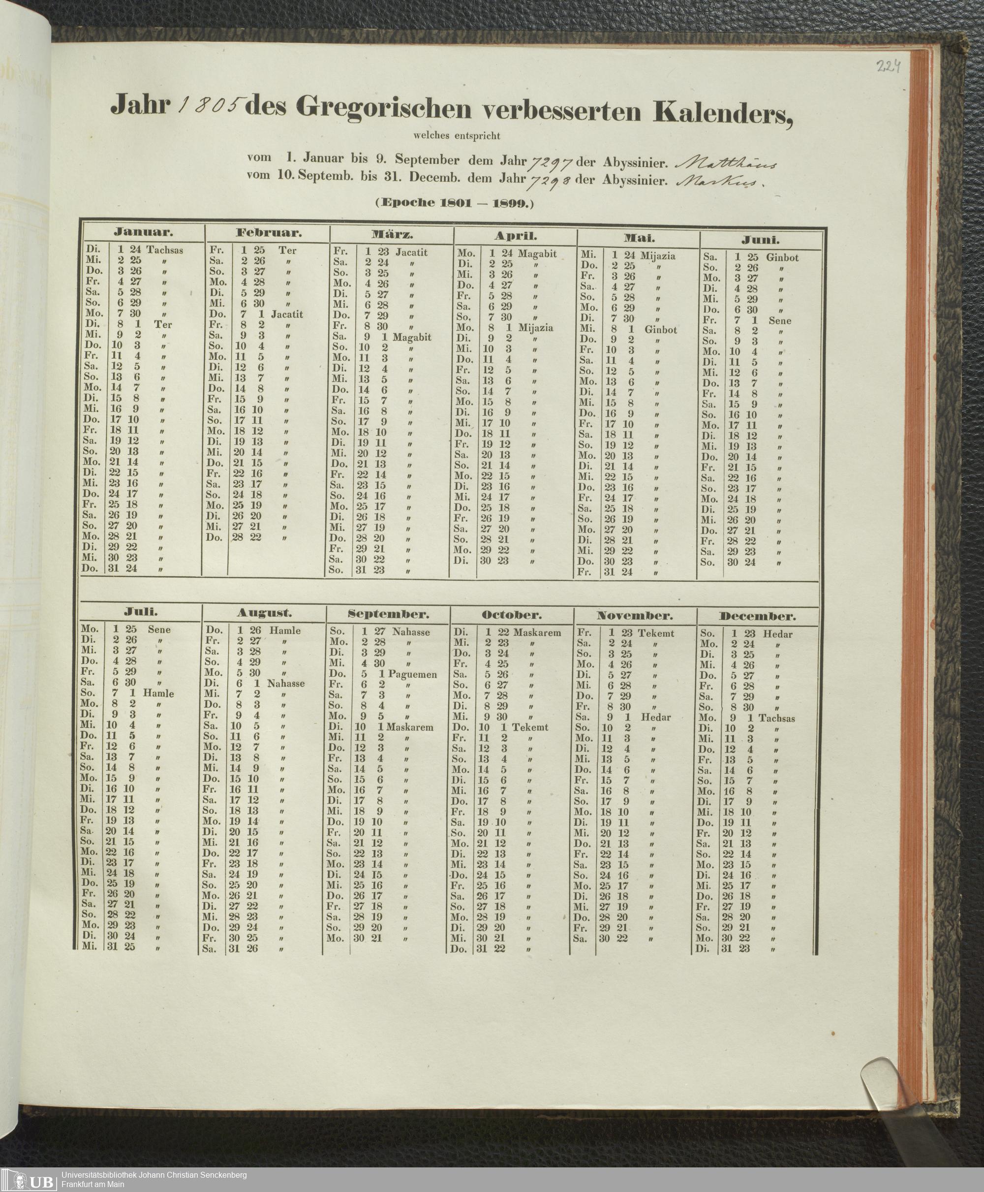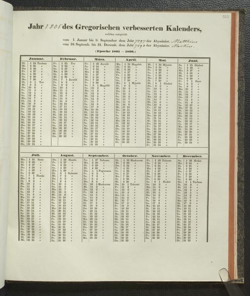 Ms. Ff. E. Rüppell IV - Kalender vom Jahr 1583 bis 1860, das heist seit der Einführung der durch Pabst Gregorius XIII verordneten Verbesserung, aus welchen Kalender die Gleichstellung dieser Zeitrechnung mit der von den Abyssiniern gebräuchlichen Chronologie ersehen werden kann; zum Behuf der geschichtlichen Forschungen der Abyssinischen Chroniken entworfen