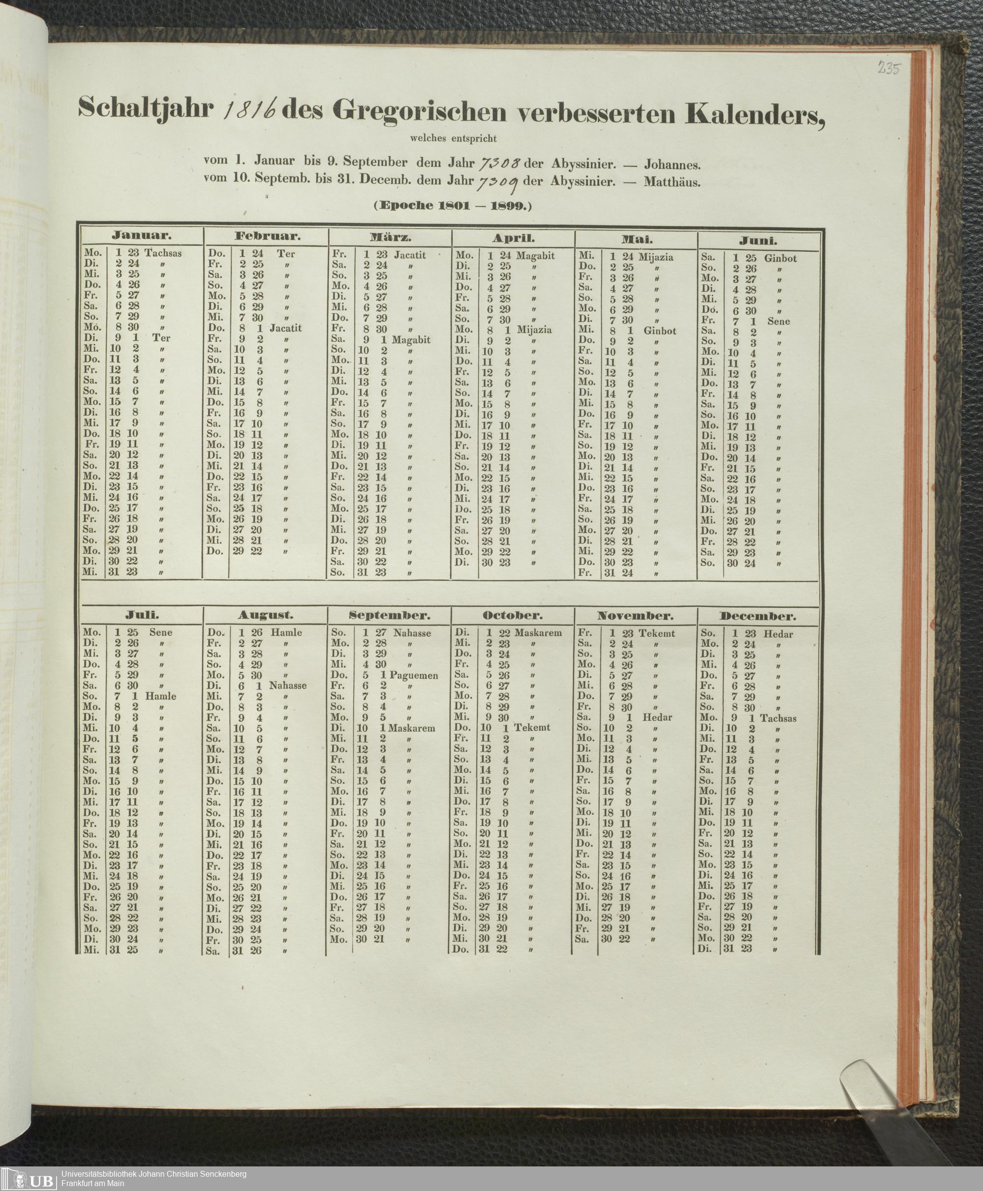 Ms. Ff. E. Rüppell IV - Kalender vom Jahr 1583 bis 1860, das heist seit der Einführung der durch Pabst Gregorius XIII verordneten Verbesserung, aus welchen Kalender die Gleichstellung dieser Zeitrechnung mit der von den Abyssiniern gebräuchlichen Chronologie ersehen werden kann; zum Behuf der geschichtlichen Forschungen der Abyssinischen Chroniken entworfen