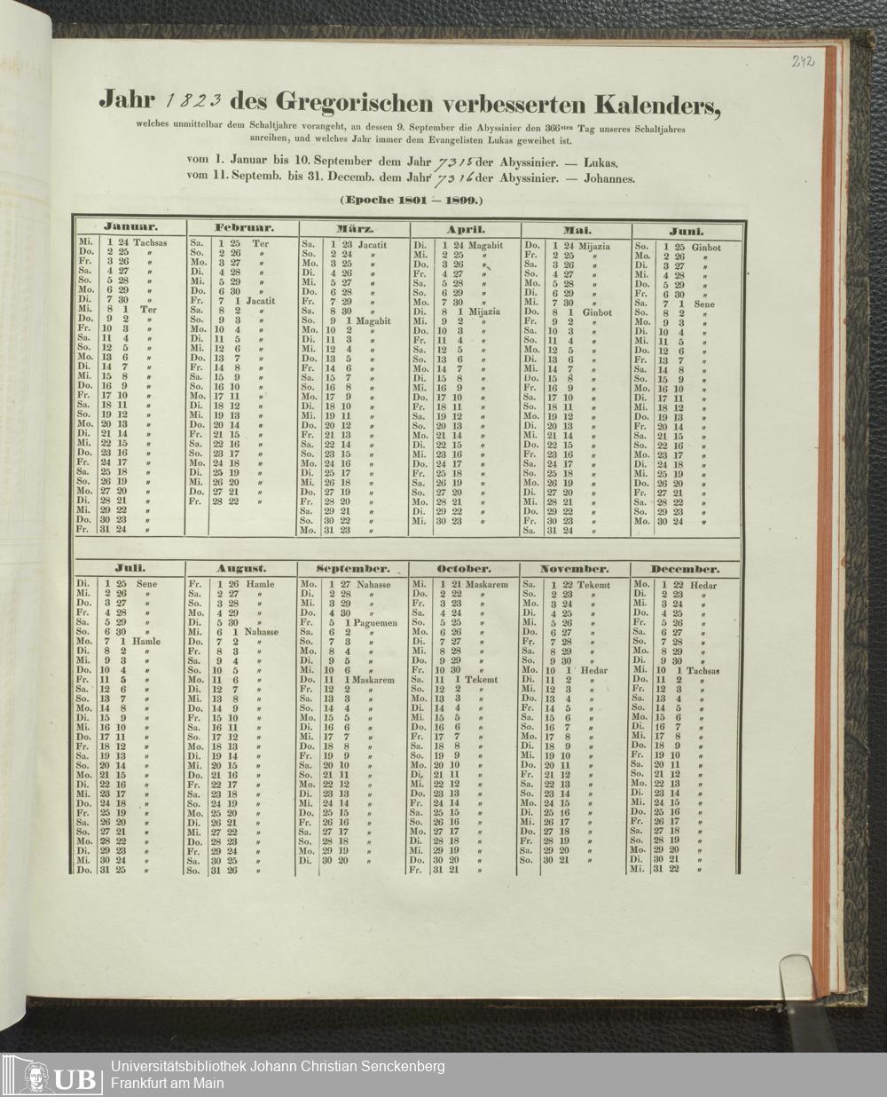 Ms. Ff. E. Rüppell IV - Kalender vom Jahr 1583 bis 1860, das heist seit der Einführung der durch Pabst Gregorius XIII verordneten Verbesserung, aus welchen Kalender die Gleichstellung dieser Zeitrechnung mit der von den Abyssiniern gebräuchlichen Chronologie ersehen werden kann; zum Behuf der geschichtlichen Forschungen der Abyssinischen Chroniken entworfen