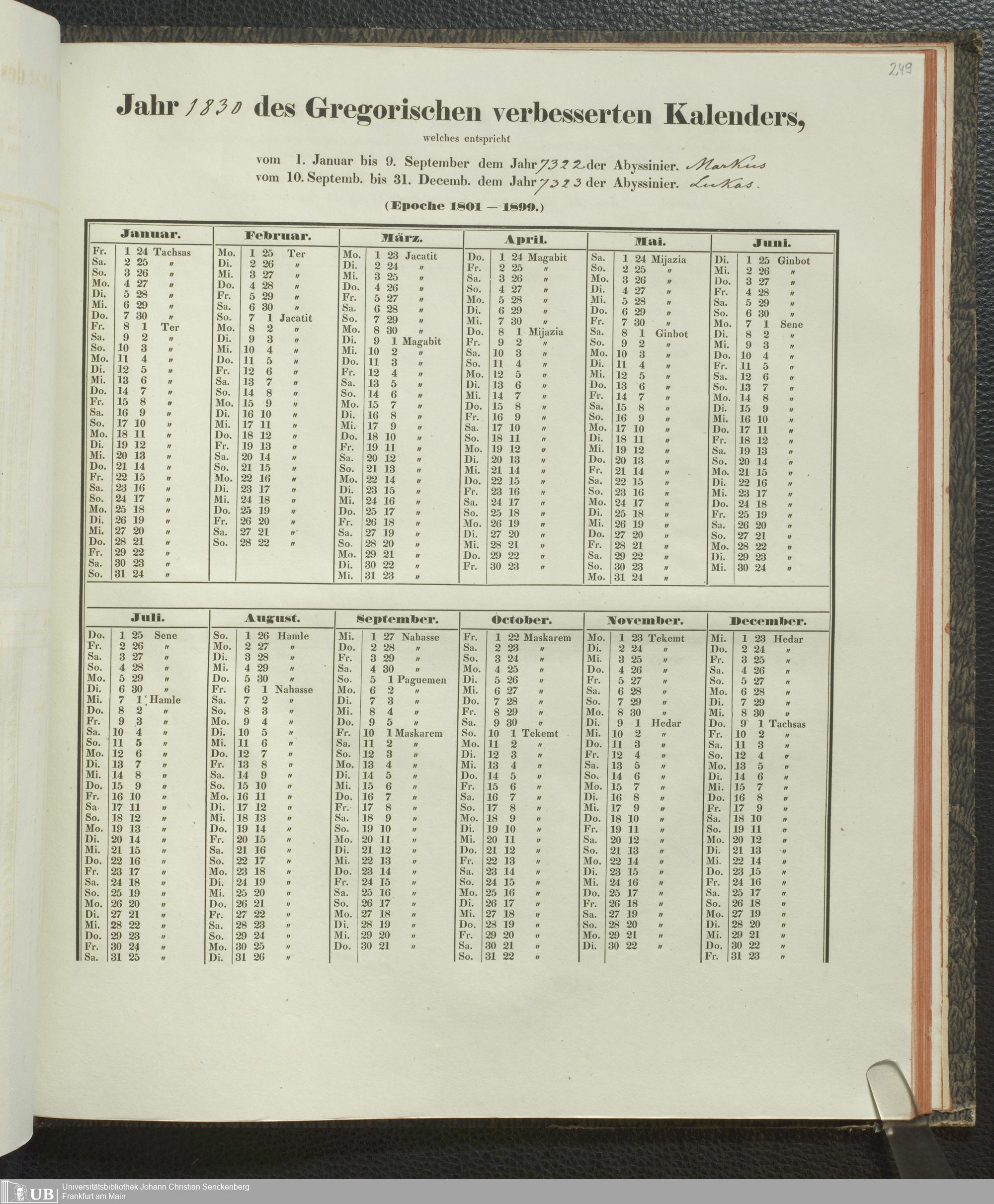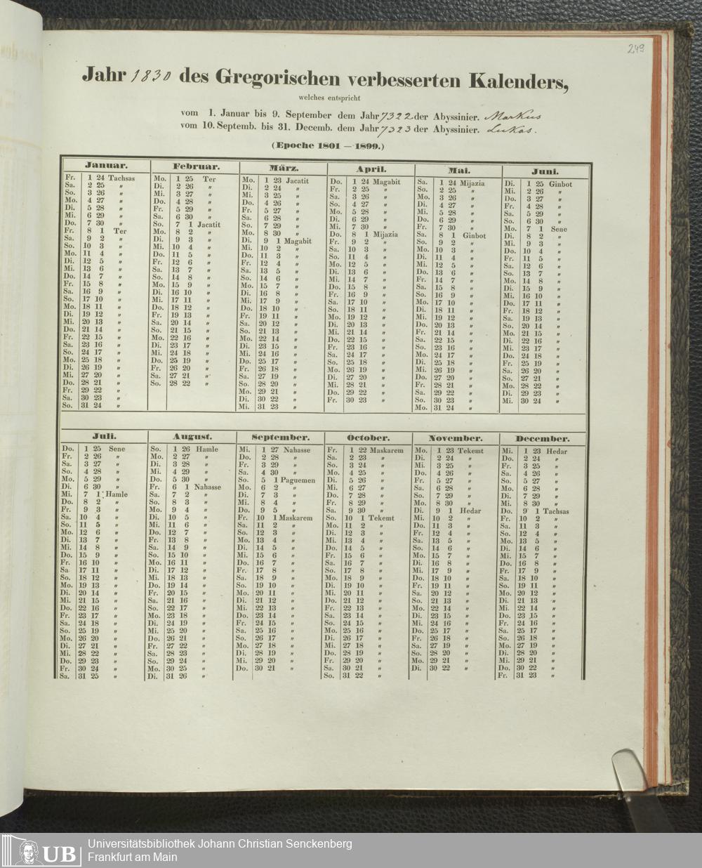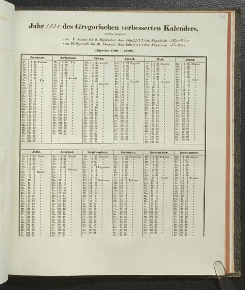 Ms. Ff. E. Rüppell IV - Kalender vom Jahr 1583 bis 1860, das heist seit der Einführung der durch Pabst Gregorius XIII verordneten Verbesserung, aus welchen Kalender die Gleichstellung dieser Zeitrechnung mit der von den Abyssiniern gebräuchlichen Chronologie ersehen werden kann; zum Behuf der geschichtlichen Forschungen der Abyssinischen Chroniken entworfen