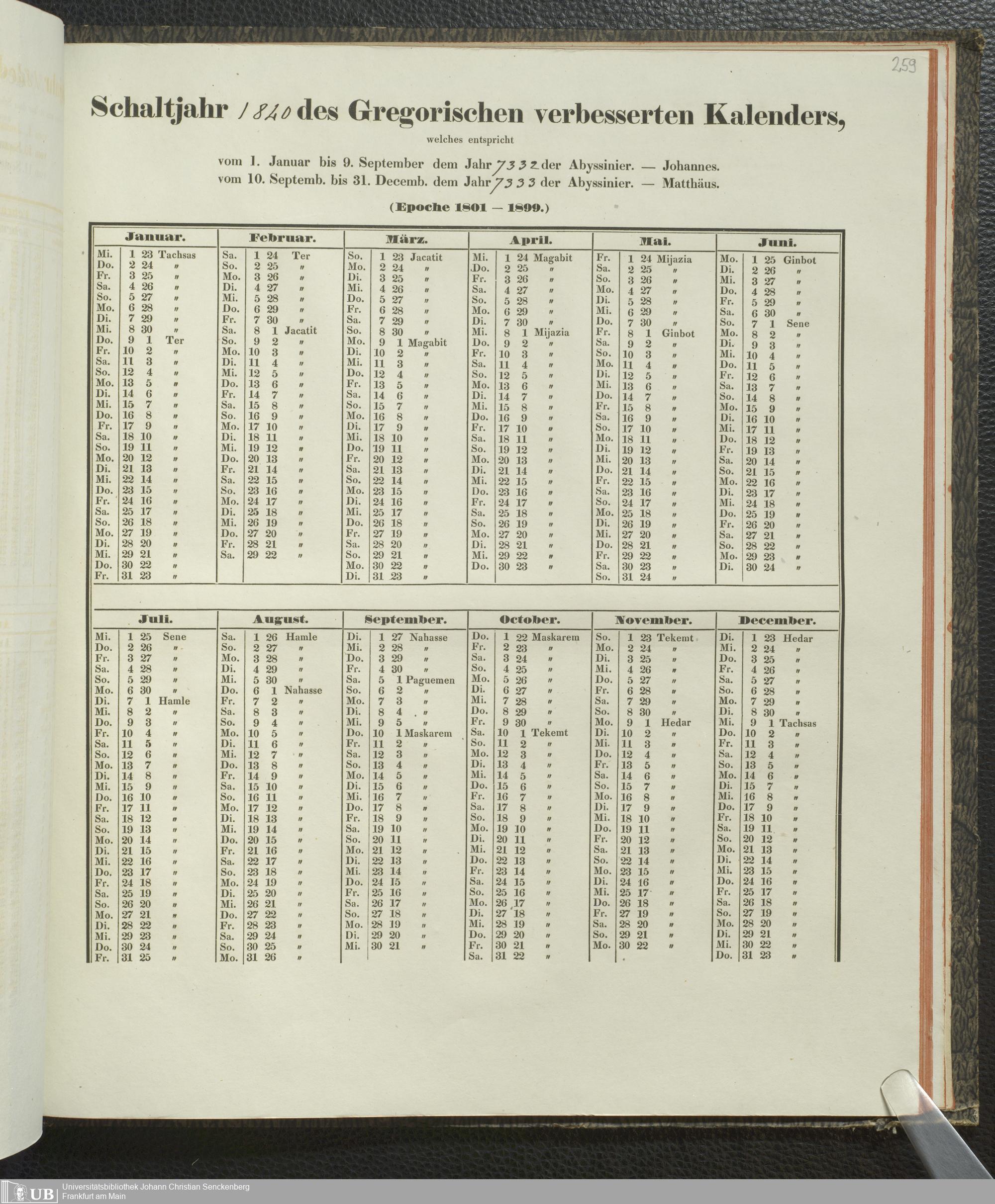 Ms. Ff. E. Rüppell IV - Kalender vom Jahr 1583 bis 1860, das heist seit der Einführung der durch Pabst Gregorius XIII verordneten Verbesserung, aus welchen Kalender die Gleichstellung dieser Zeitrechnung mit der von den Abyssiniern gebräuchlichen Chronologie ersehen werden kann; zum Behuf der geschichtlichen Forschungen der Abyssinischen Chroniken entworfen