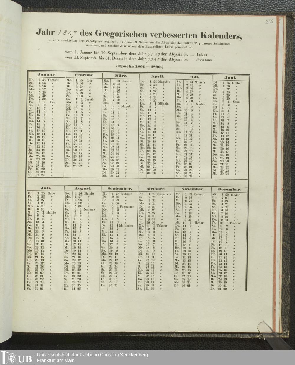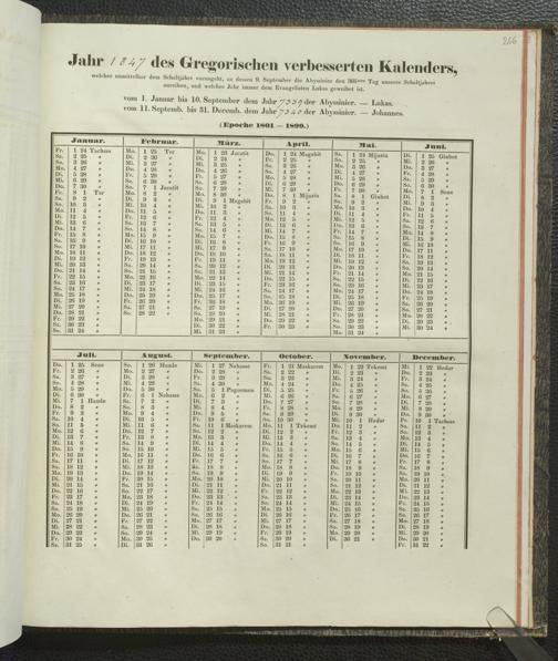 Ms. Ff. E. Rüppell IV - Kalender vom Jahr 1583 bis 1860, das heist seit der Einführung der durch Pabst Gregorius XIII verordneten Verbesserung, aus welchen Kalender die Gleichstellung dieser Zeitrechnung mit der von den Abyssiniern gebräuchlichen Chronologie ersehen werden kann; zum Behuf der geschichtlichen Forschungen der Abyssinischen Chroniken entworfen
