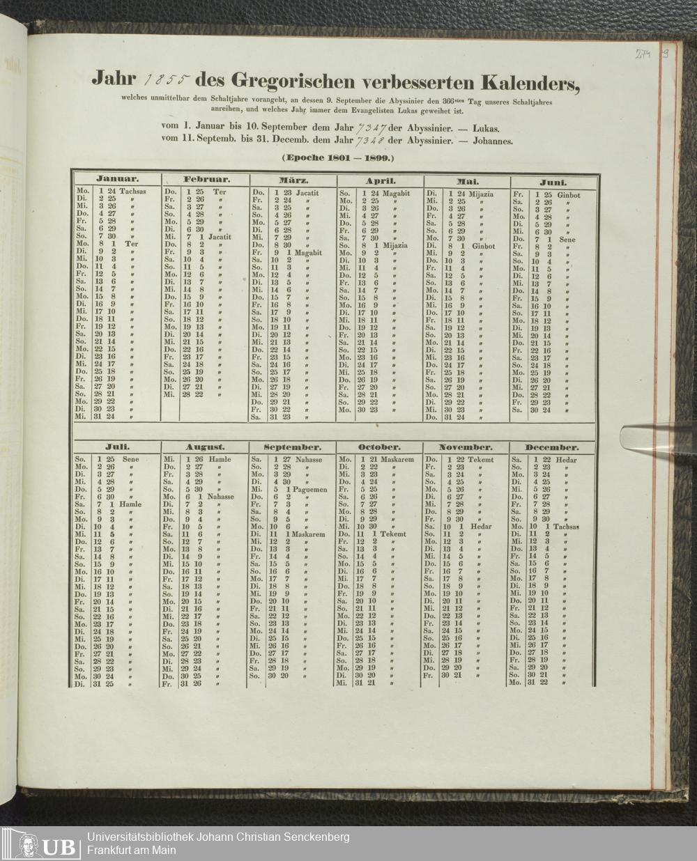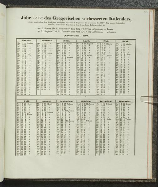 Ms. Ff. E. Rüppell IV - Kalender vom Jahr 1583 bis 1860, das heist seit der Einführung der durch Pabst Gregorius XIII verordneten Verbesserung, aus welchen Kalender die Gleichstellung dieser Zeitrechnung mit der von den Abyssiniern gebräuchlichen Chronologie ersehen werden kann; zum Behuf der geschichtlichen Forschungen der Abyssinischen Chroniken entworfen