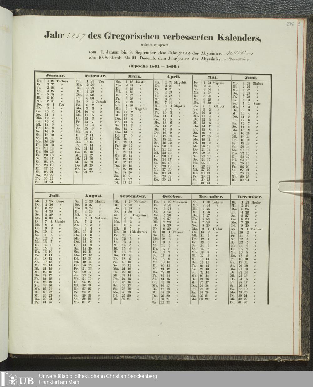 Ms. Ff. E. Rüppell IV - Kalender vom Jahr 1583 bis 1860, das heist seit der Einführung der durch Pabst Gregorius XIII verordneten Verbesserung, aus welchen Kalender die Gleichstellung dieser Zeitrechnung mit der von den Abyssiniern gebräuchlichen Chronologie ersehen werden kann; zum Behuf der geschichtlichen Forschungen der Abyssinischen Chroniken entworfen