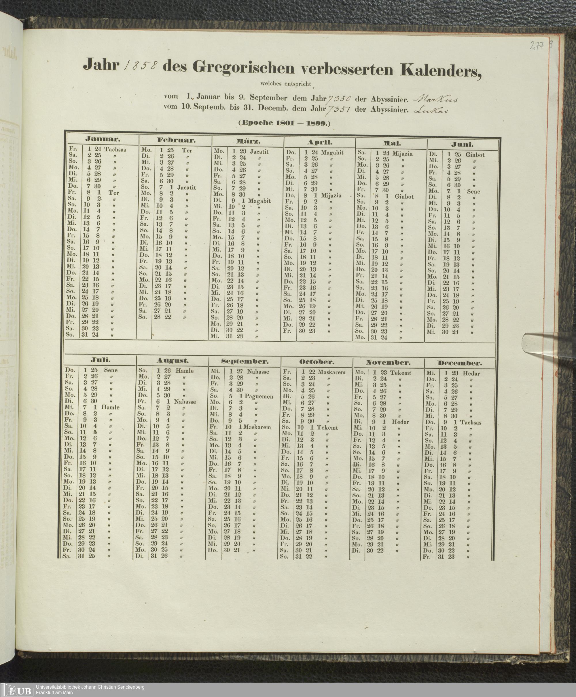 Ms. Ff. E. Rüppell IV - Kalender vom Jahr 1583 bis 1860, das heist seit der Einführung der durch Pabst Gregorius XIII verordneten Verbesserung, aus welchen Kalender die Gleichstellung dieser Zeitrechnung mit der von den Abyssiniern gebräuchlichen Chronologie ersehen werden kann; zum Behuf der geschichtlichen Forschungen der Abyssinischen Chroniken entworfen
